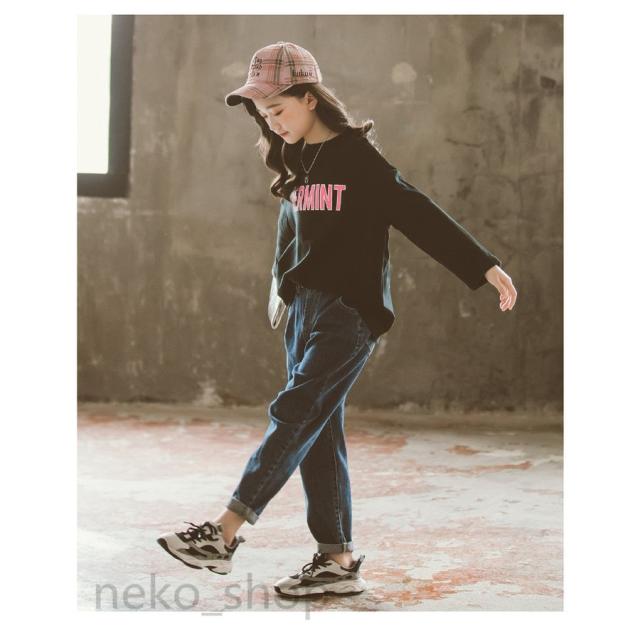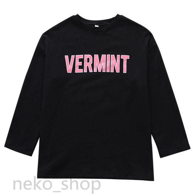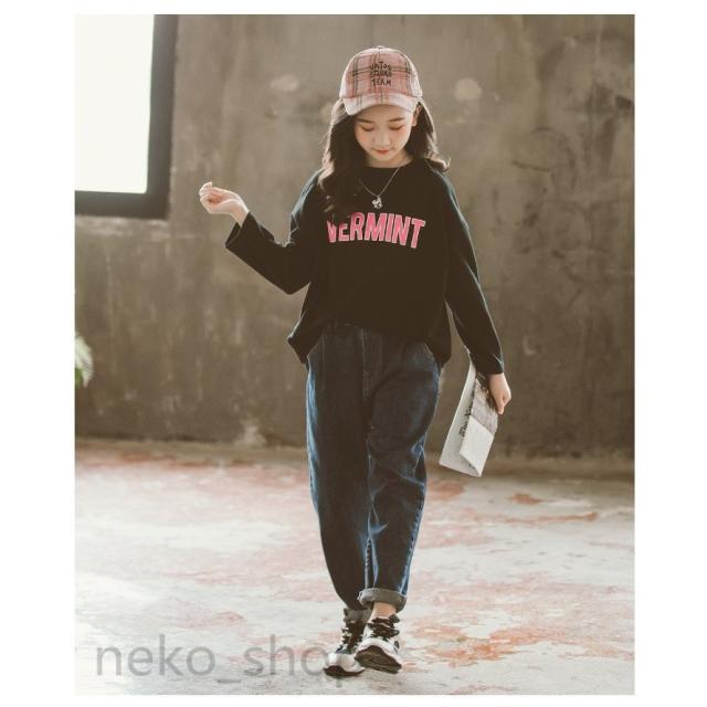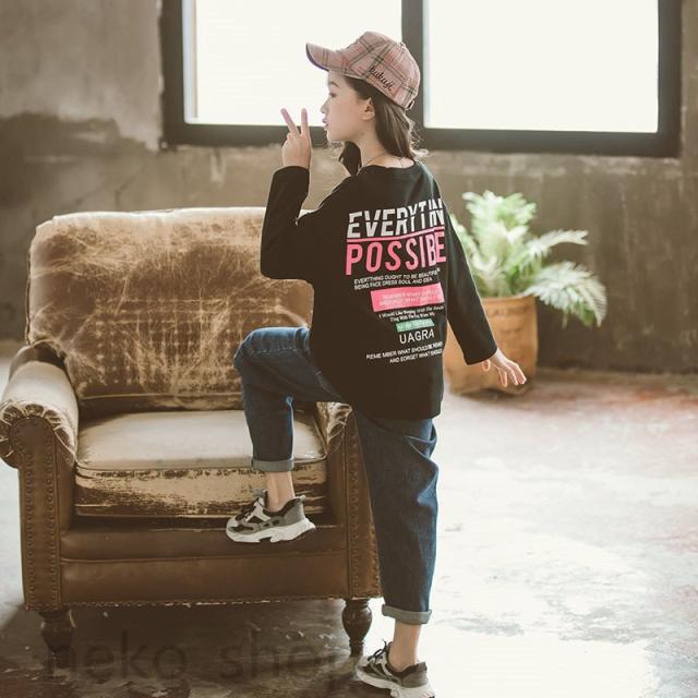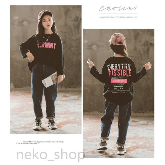 ロゴプリント コットン Tシャツ 長袖 キッズ 子供服 女の子 ジュニア トップス 重ね着風 オーバーサイズ ガールズ 女児 カジュアル 可愛い 通学 普段着 おしゃれ