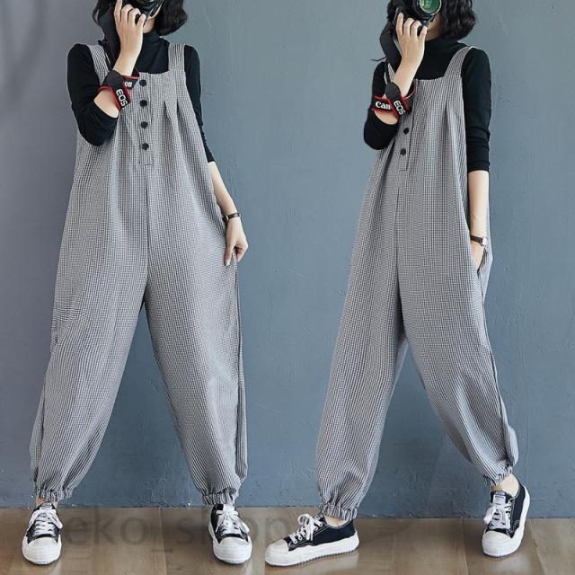 チェック柄 オールインワン サロペット レディース ワイドパンツ ガウチョパンツ ゆったり ストレート ロングパンツ ハイウエスト コーデ 体型カバー ボトムス