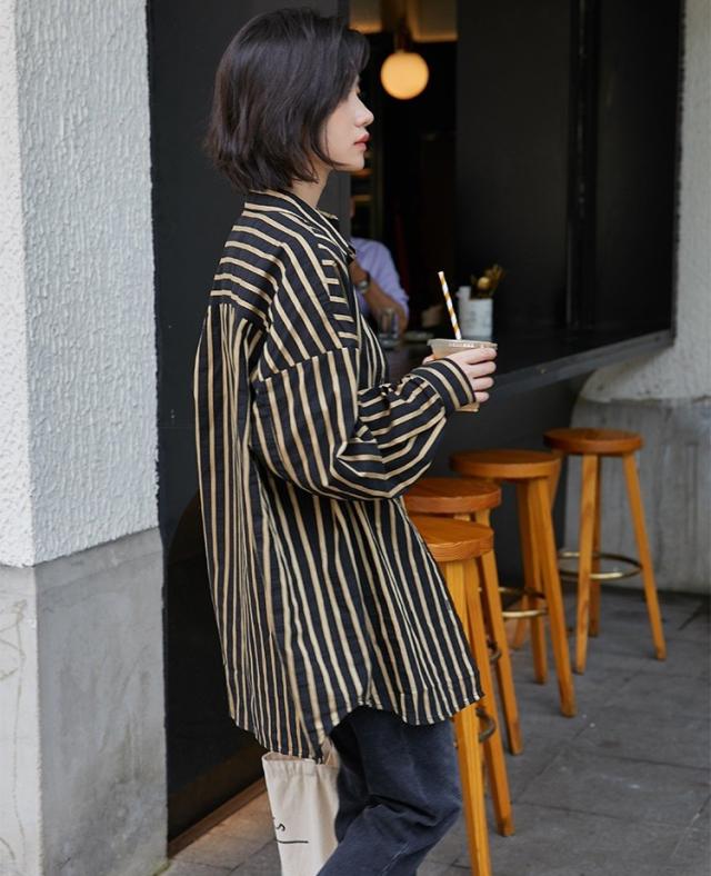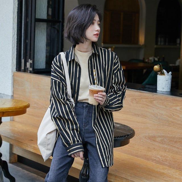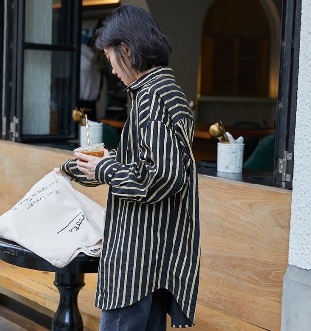 ブラウス レディース 春秋 長袖 Vネック ストライプ 体型カバー 韓国風 ゆったり BFブラウス 大きいサイズ きれいめ ロング丈ブラウス おしゃれ カジュアル