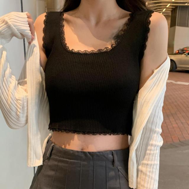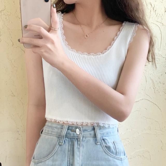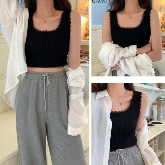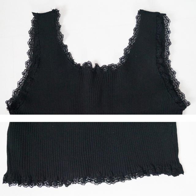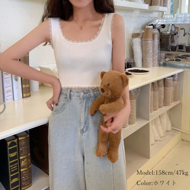 タンクトップ へそ出し サマーニット ショート丈 レースキャミソール ラウンドネックインナー 重ね着 リブニット ノースリーブ【ネコポス可】