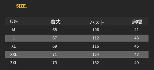 | サイズについての説明 | ■サイズ: M/L/XL/2XL/3XL ■商品写真はできる限り実物の色に近づけるよう加工しておりますが、お客様のお使いのモニター設定、お部屋の照明等により実際の商品と色味が異なる場合がございます。 ■サイズ詳細等の測り方はスタッフ間で統一、徹底はしておりますが、若干の誤差がある場合がございます。 |