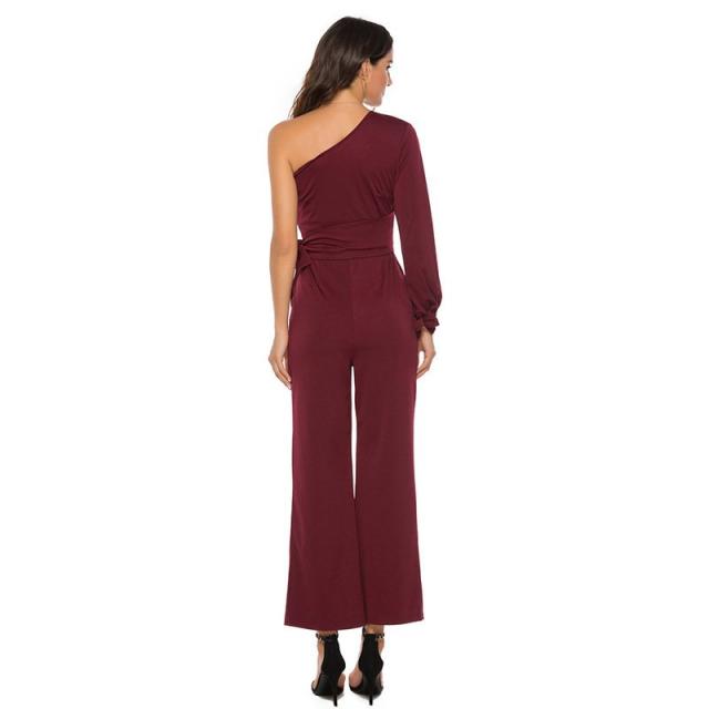 オールインワン ジャンプスーツ つなぎ レディース 女性用 ワンオフショルダー 長袖 ウエストリボン シンプル 無地 単色 セクシー おしゃれ パーテ