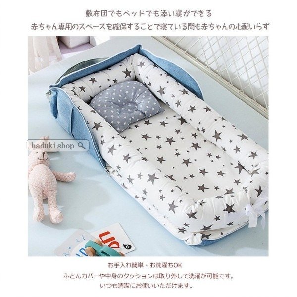 | サイズについての説明 | 関連キーワード:ベビーベッド 折りたたみ 持ち運び 赤ちゃん ベッドインベッド おりたたみ ベビー 簡易 ミニ ベッド 収納 添い寝 ガード 寝返り防止 長く使える ガードクッション 寝返り防止 長く使える 【赤ちゃんもママも安心】 ママのお腹の中にいるような感覚を再現し赤ちゃんに安心感を与え快適な眠りをサポートします。赤ちゃんを包み込む仕様で、添い寝の時にパパ、ママが寝返りを打っても安心です。 【高品質なクッション】 高品質で程良い弾力性のあるクッション。 枕も付属しており赤ちゃんも心地よく寝れます。 【おむつ替え簡単・ベッドシート付属】 リボン部分を解けば簡単におむつ替えが可能です。通気性に優れたベッドシート付で、赤ちゃんの寝汗もしっかり吸収します。 【超軽量・持ち運び楽々】 コンパクトに収納でき、軽量で持ち運びも楽々♪外出、旅行先でも便利です。家事に合わせて赤ちゃんも一緒に移動できるので、普段使いのクーハンとしてもおすすめです。 【お手入れ簡単・お洗濯もOK】 ふとんカバーや中身のクッションは取り外して洗濯が可能です。いつも清潔にお使いいただけます。 |