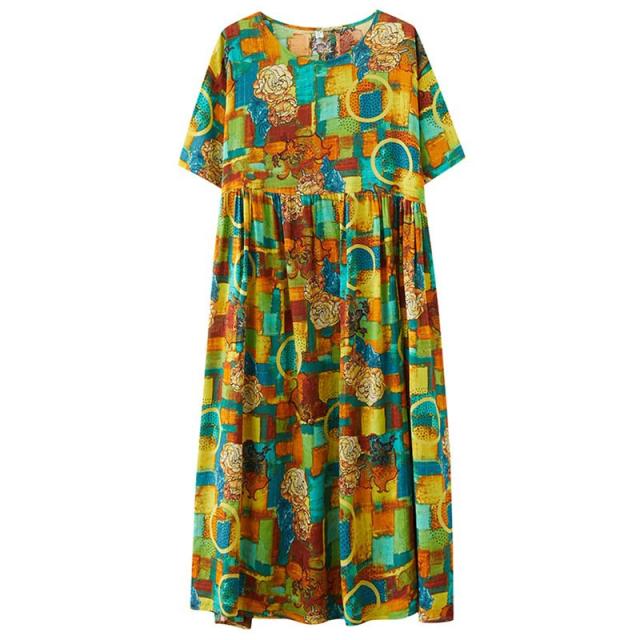 ワンピース レディース 五分袖 ラウンドネック Aライン ロング丈 マキシ丈 ウエスト切り替え 花柄 フラワー バラ ゆったり 普段使い お出かけ 女