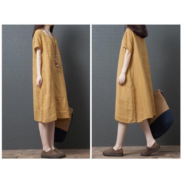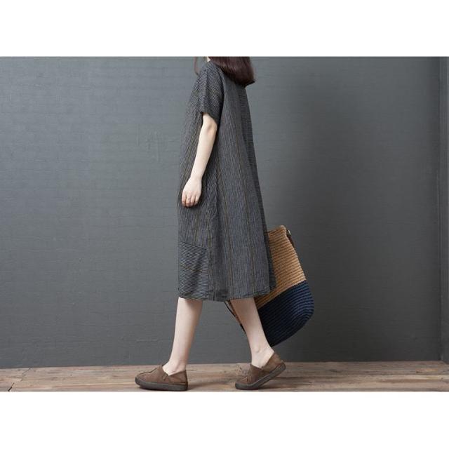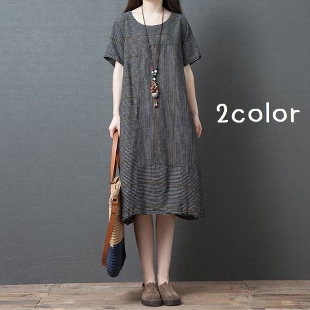 ワンピース 半袖 レディース 婦人 膝丈 ひざ丈 ラウンドネック ポケット ストライプ カジュアル シンプル おしゃれ おでかけ 楽チン