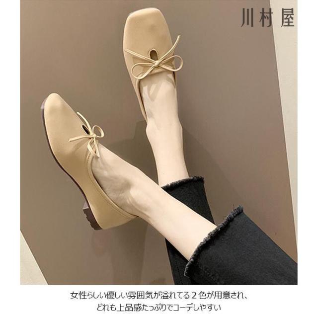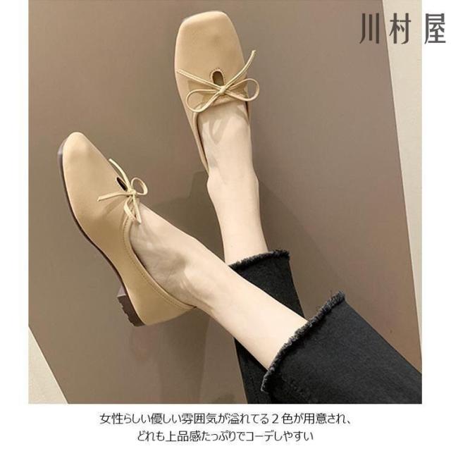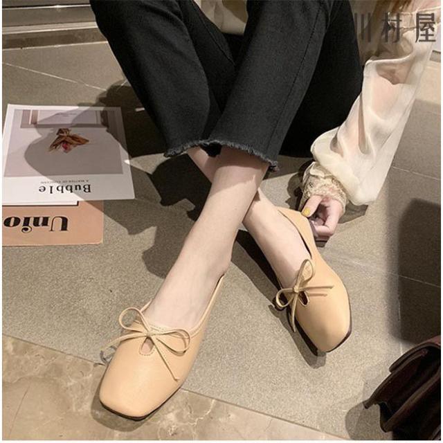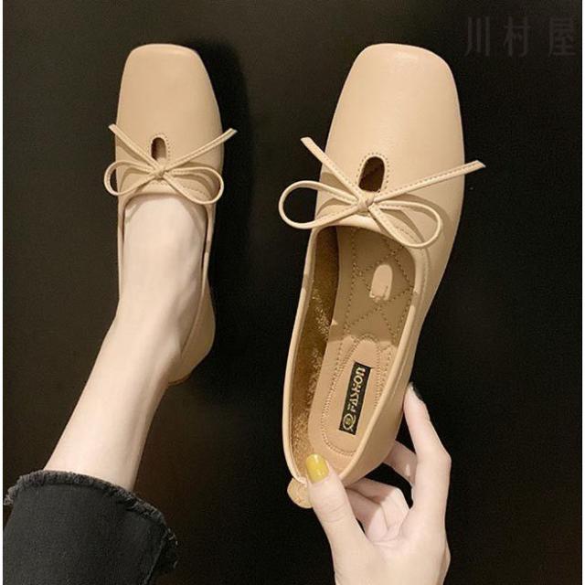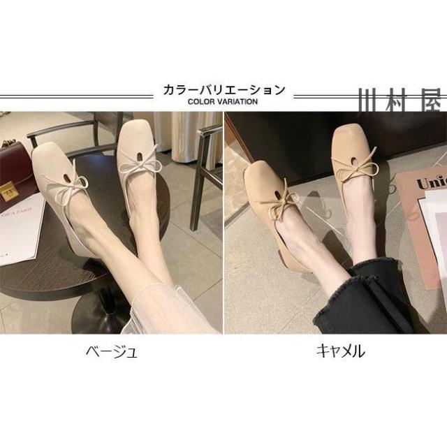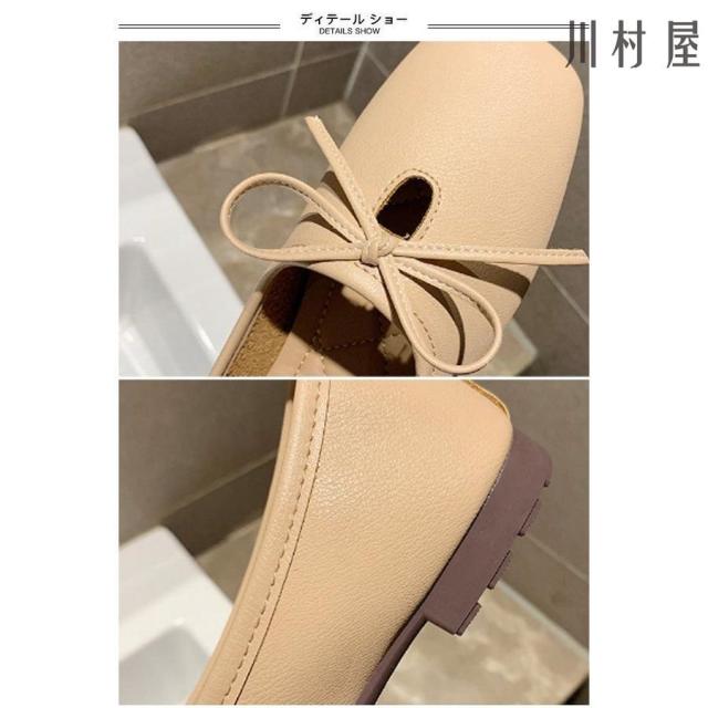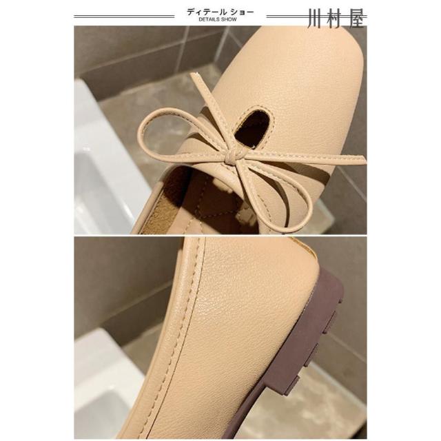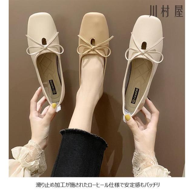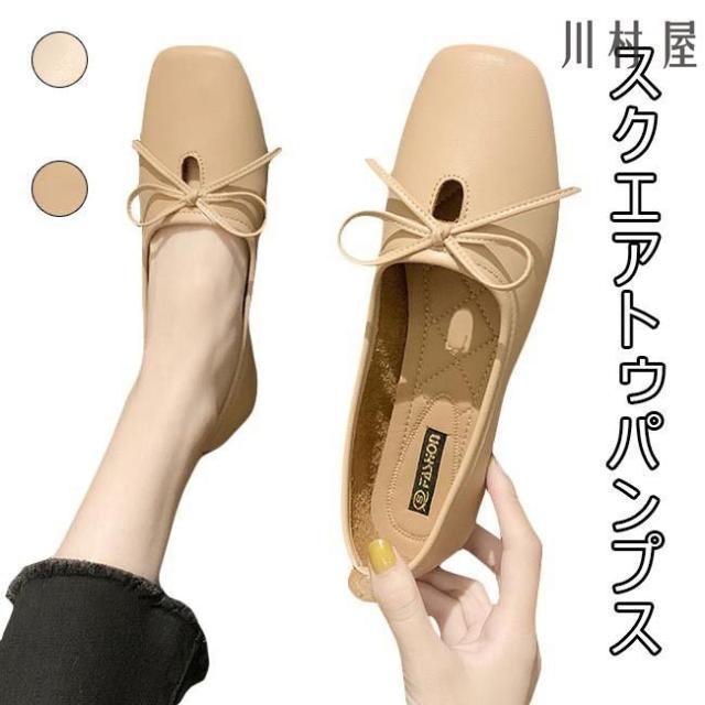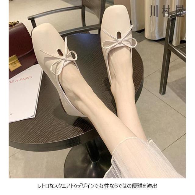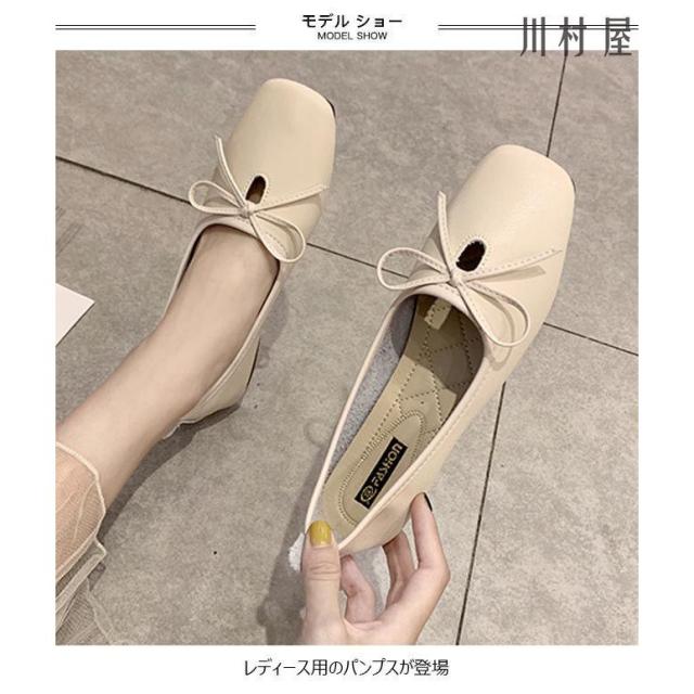 パンプス レディース PUパンプス ローヒール スクエアトゥパンプス フラットシューズ 蝶結び ローファー 女性 PUシューズ レトロ 太ヒール 靴
