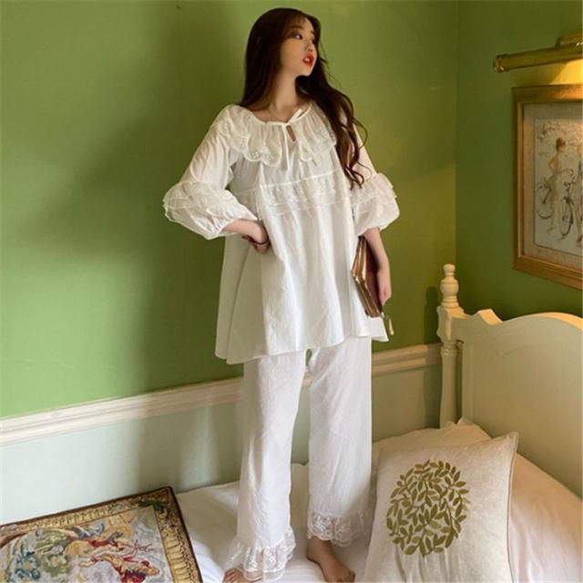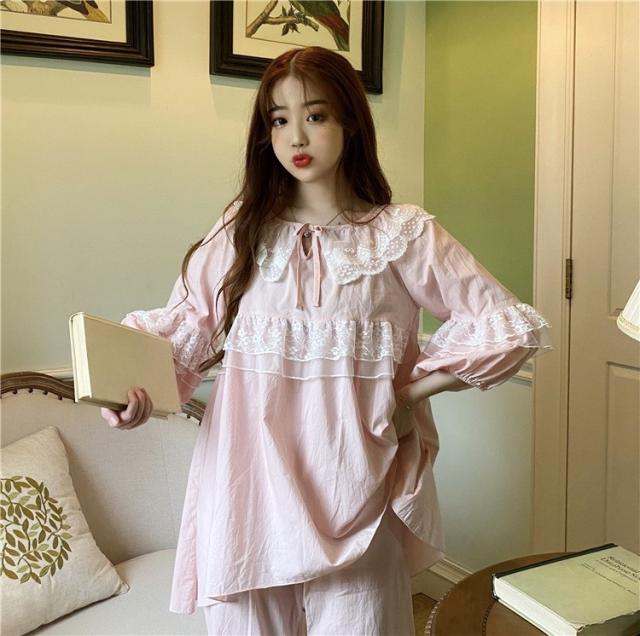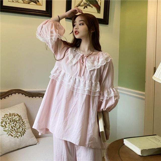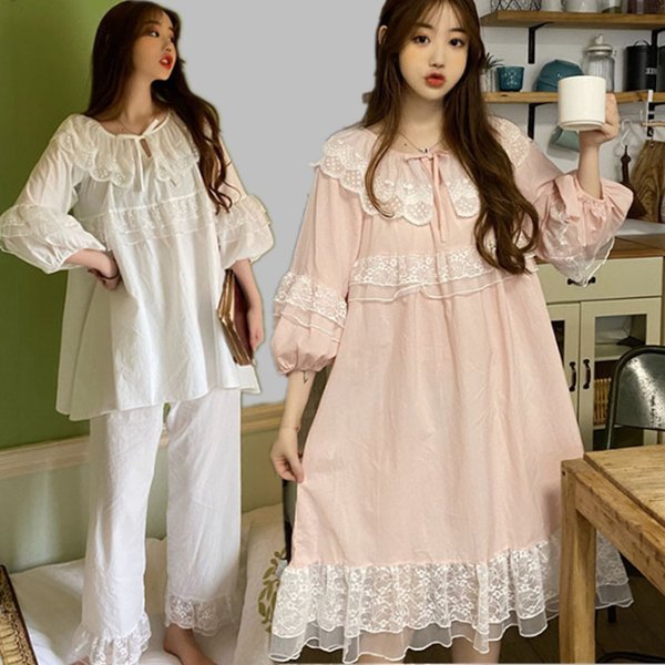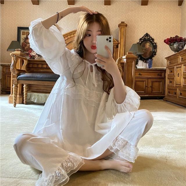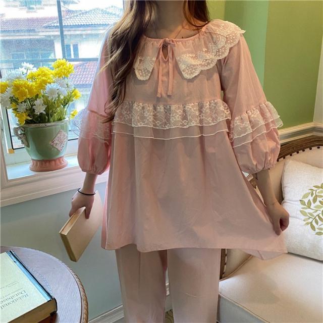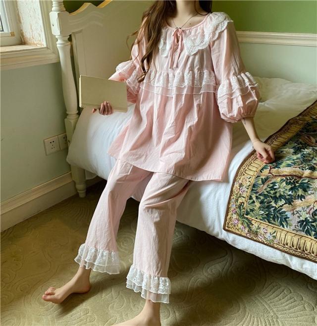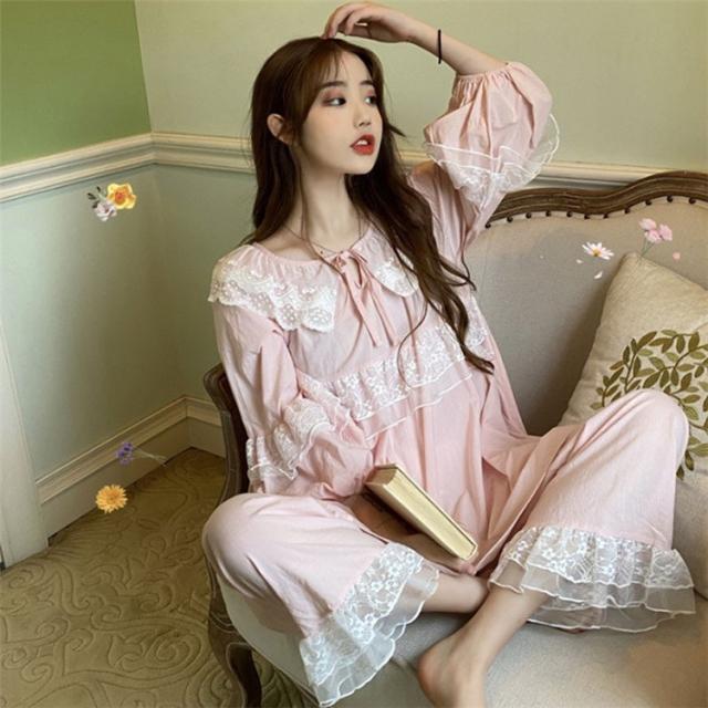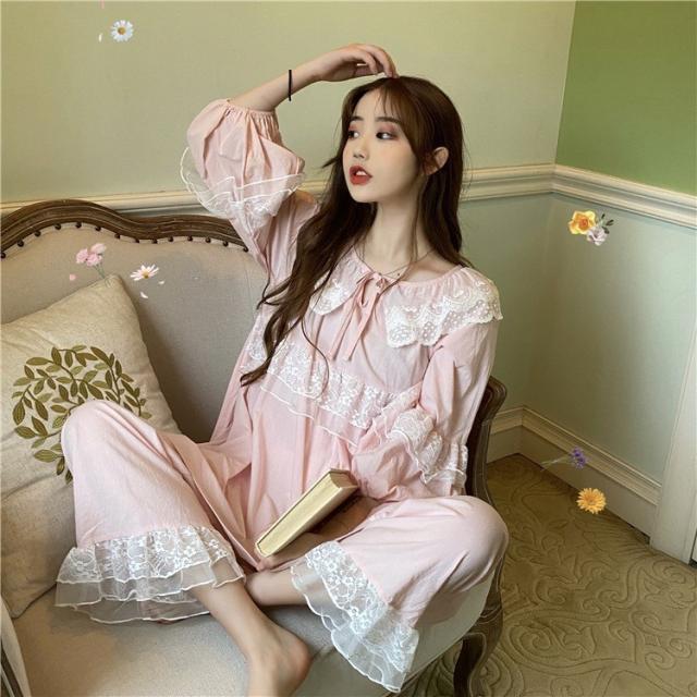 パジャマ レディース 春 夏 秋 長袖 綿 セットアップ レース ナイティ ルームウェア 女性 可愛い 部屋着 女性パジャマ ピンク 韓国風