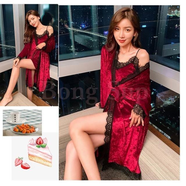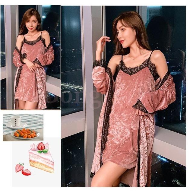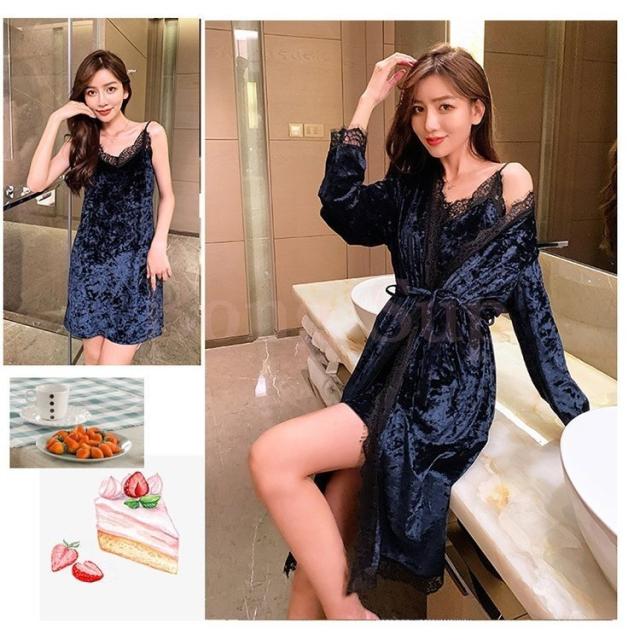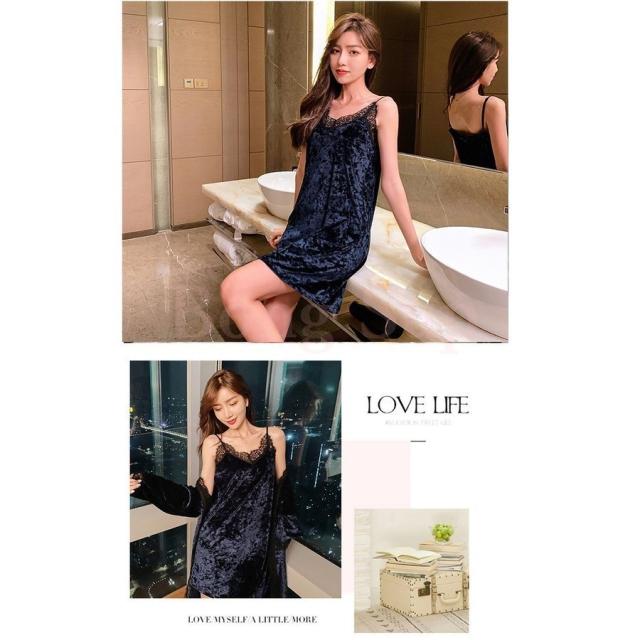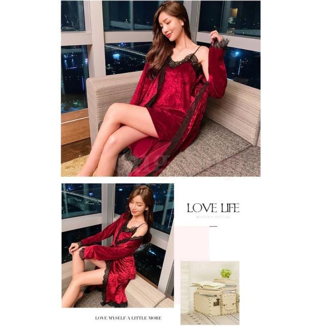 ネグリジェ ルームウェア レディース 秋冬 長袖ナイトガウン キャミワンピース セクシーレース ベルベット2点セット ネグリジェ 暖かい 部屋着 厚手パジャマ