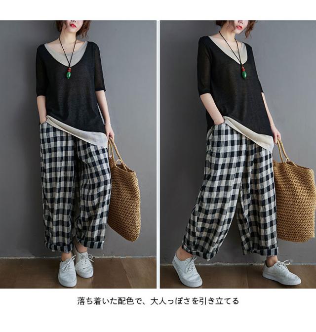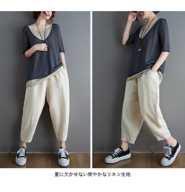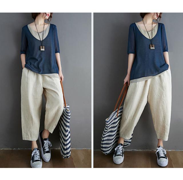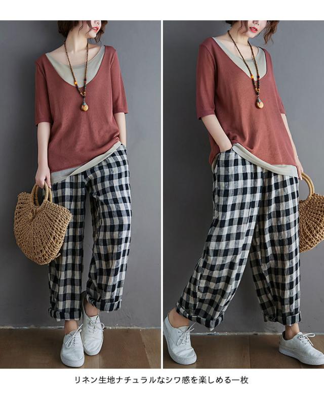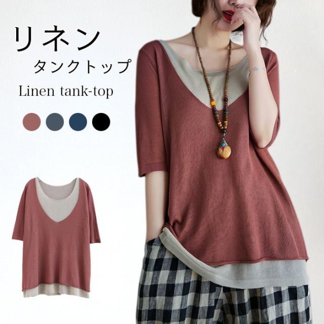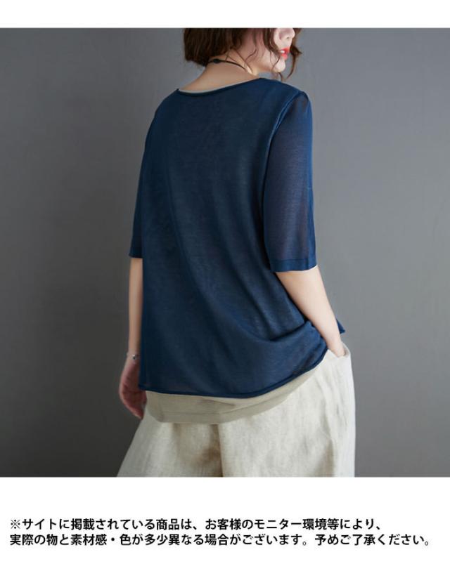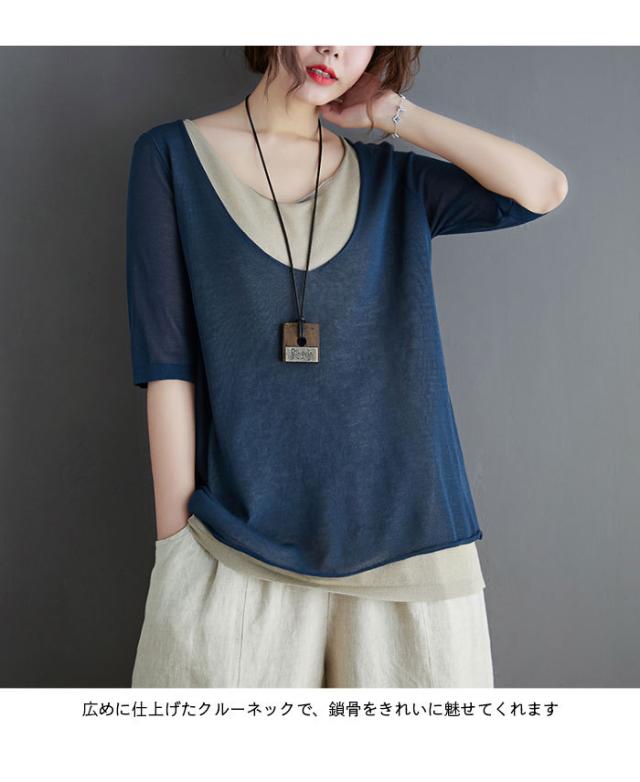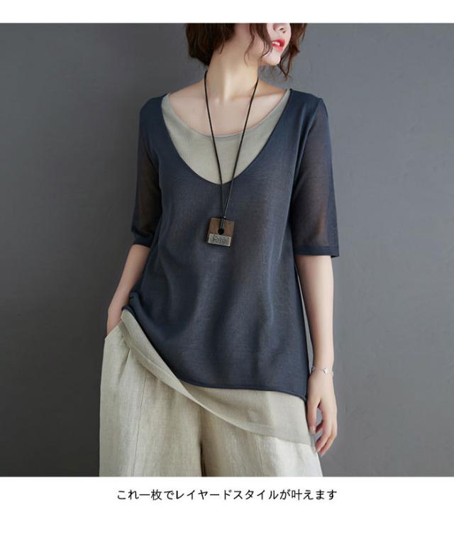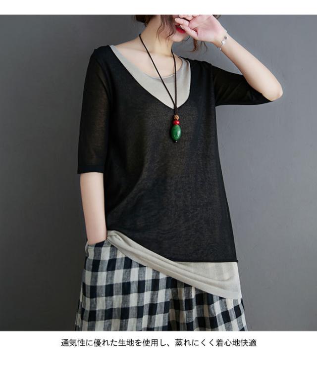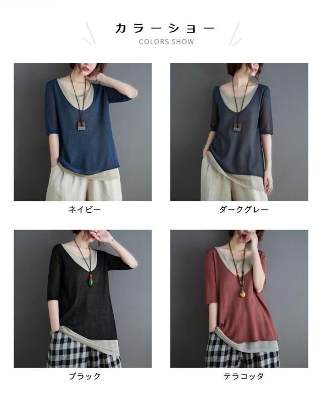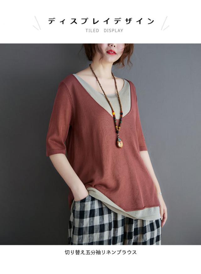 【送料無料】リネン混ブラウス 麻 リネン混 リネンブラウス 五分袖 ラウンドネック クルーネック フェイクレイヤード 切り替え 透け感 ゆったり