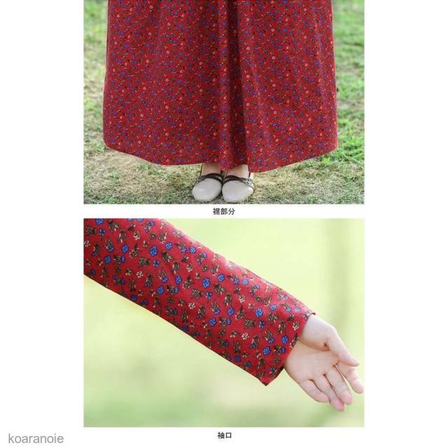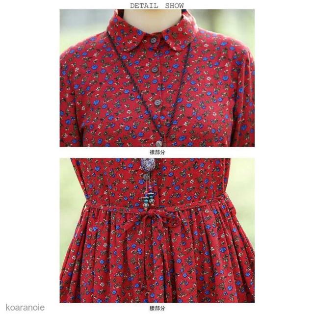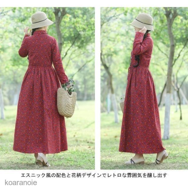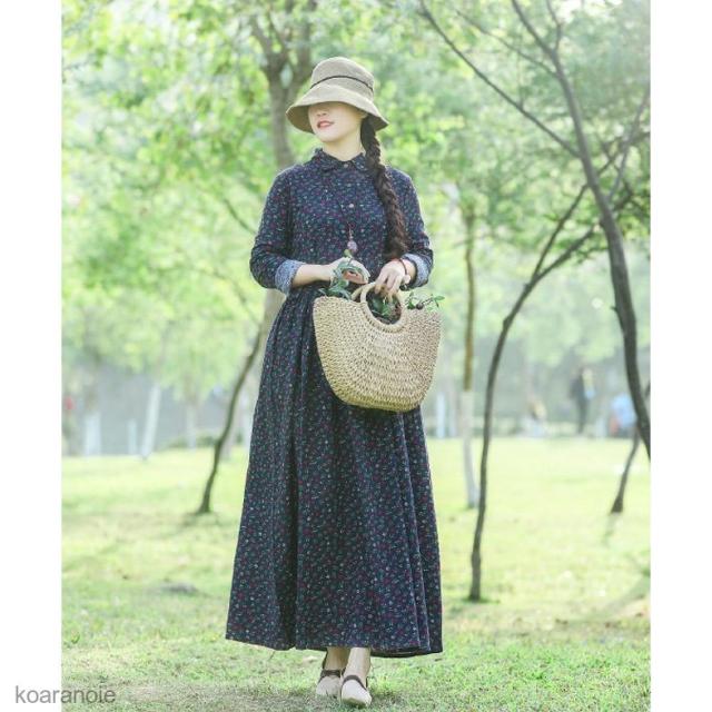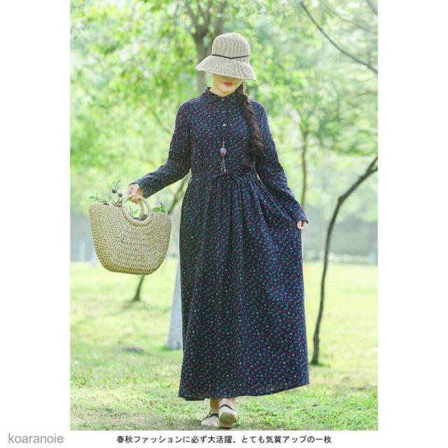 ロングワンピ 長袖 花柄 マキシ丈ワンピース リネン エスニック風 薄手 ワンピース レディース 長袖ワンピース 春秋 レトロ ハイウエスト