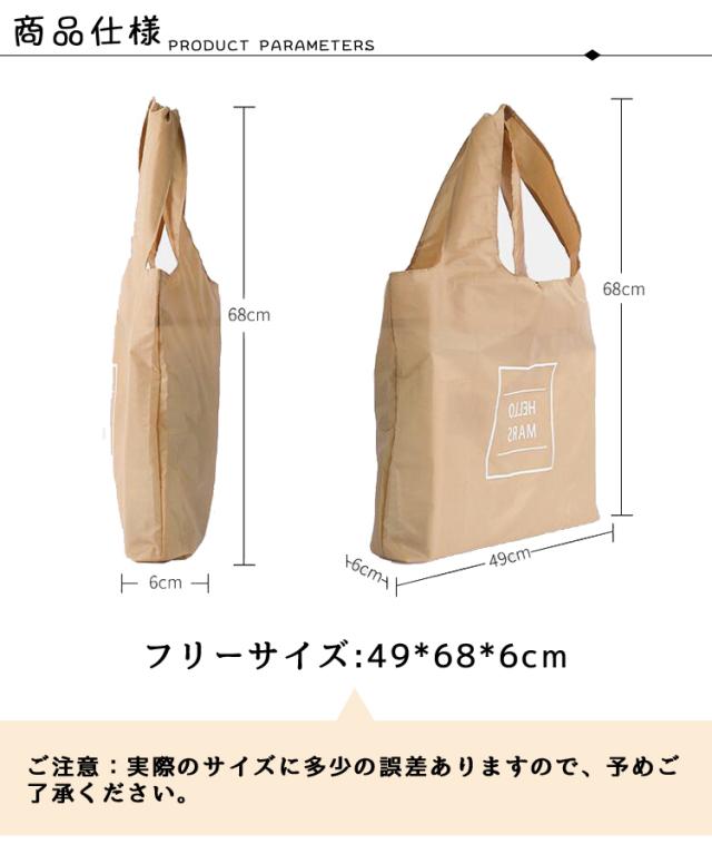 | サイズについての説明 | シンプルで使いやすいエコバッグです。 簡単収納、広げればちょうどいいサイズ感で使い勝手も抜群です。 機能性を重視したエコバッグはコンパクトにポケットサイズに収納でき、持ち運びらくらくです。 肩掛けや手さげとしてお買い物バッグとしてご利用いただけます。 ※サイズ表記は目安です。誤差はご了承ください。 ※ロット生産の為、色味や素材が一部変更になる場合がございます。予めご了承ください。 ※モニター環境や生産の関係により写真と色、柄が若干異なる場合があります。 ※画像の商品はサンプルです。実際の商品とは仕様、加工、サイズ、素材が若干異なる場合がございます。 ※商品は縫製上の細かいほつれ、汚れ、素材特有の臭いや接着剤等の臭いが残っている場合がございますので、気になるお客様はご購入をお控え下さい。 |