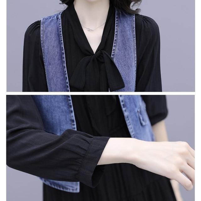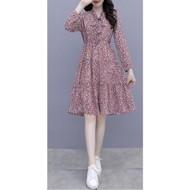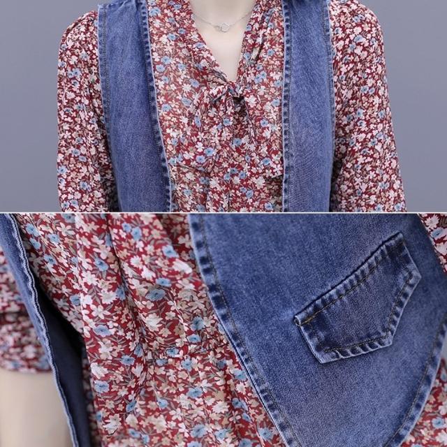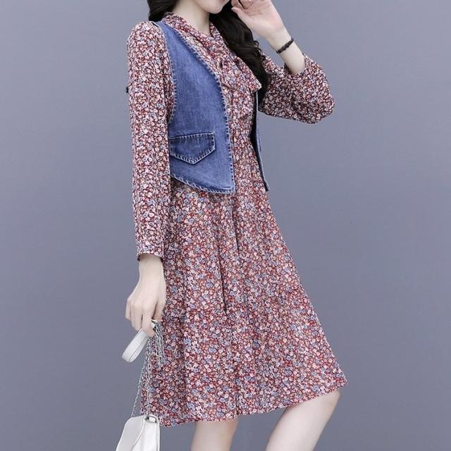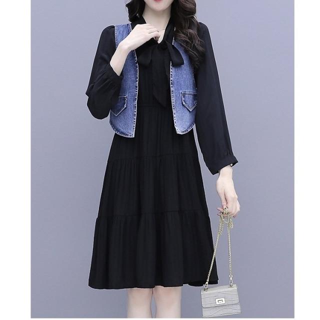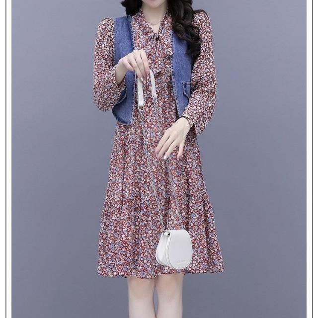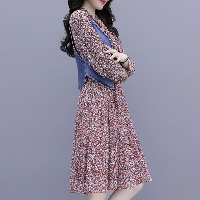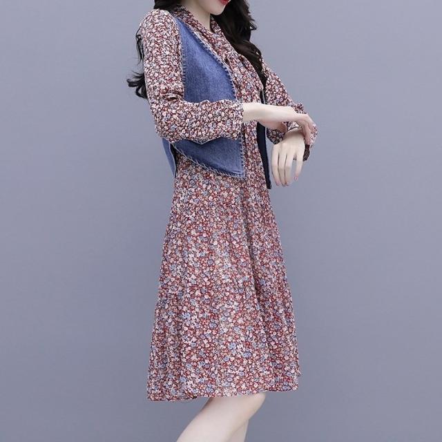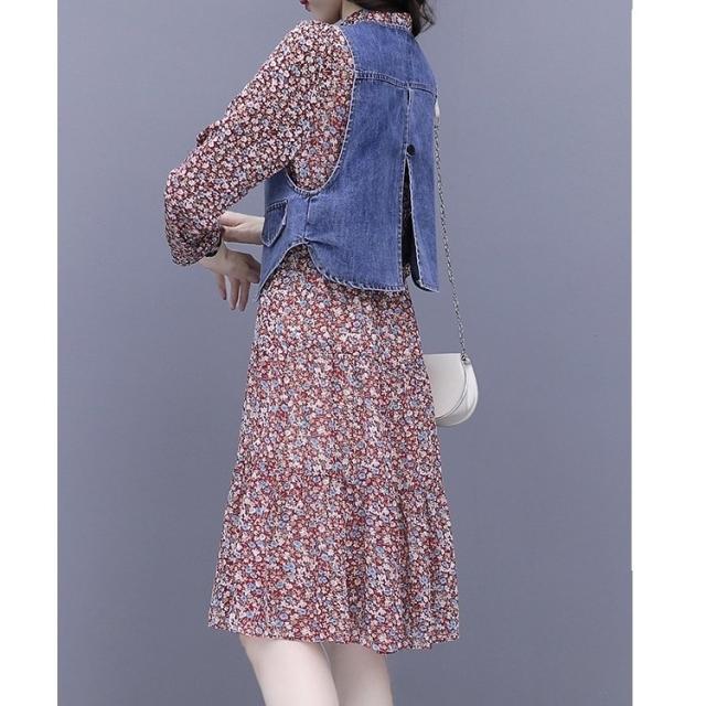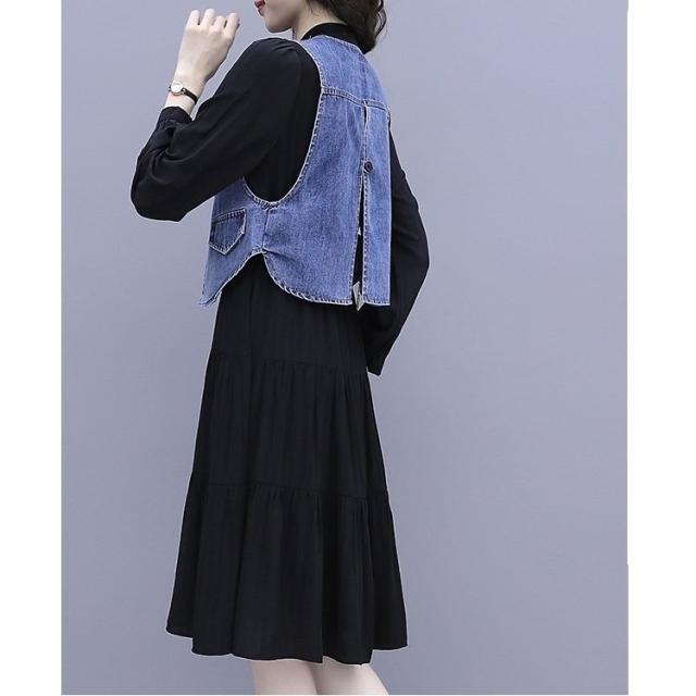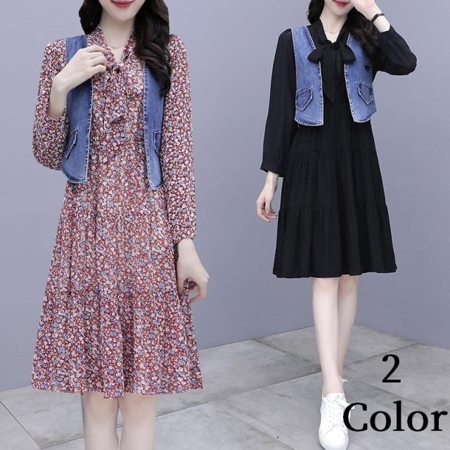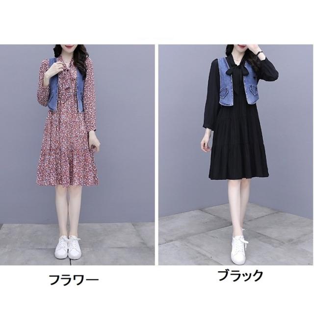 ワンピース レディース フレア 長袖 ひざ丈 膝丈 ベスト ジレ 2点セット 無地 花柄 デニム かわいい おしゃれ きれいめ カジュアル