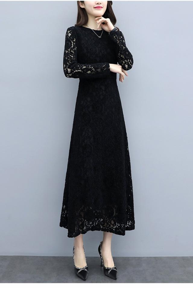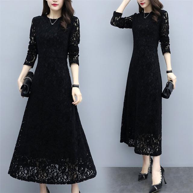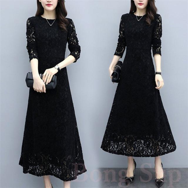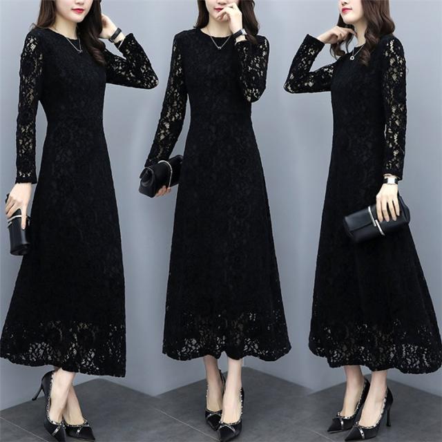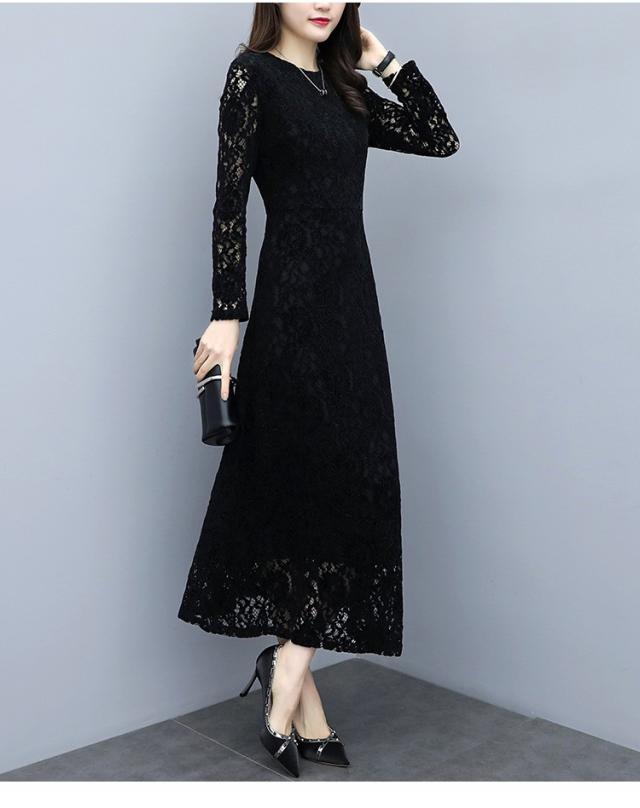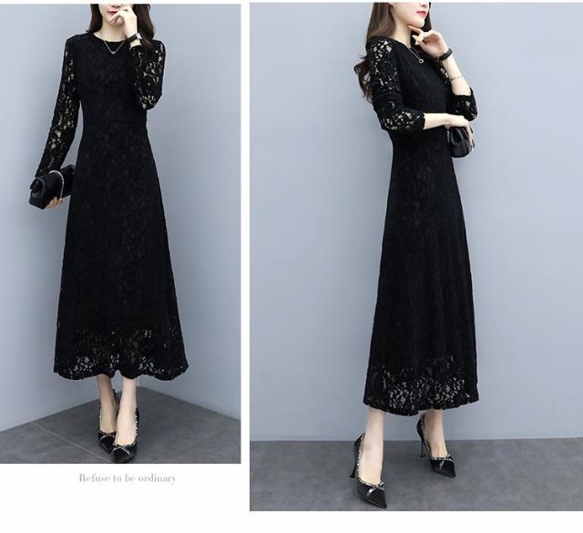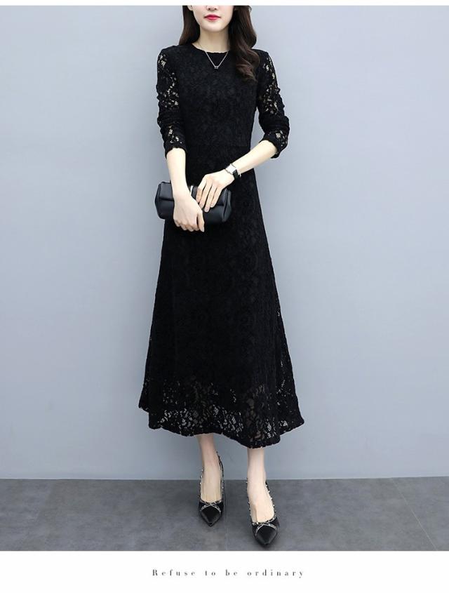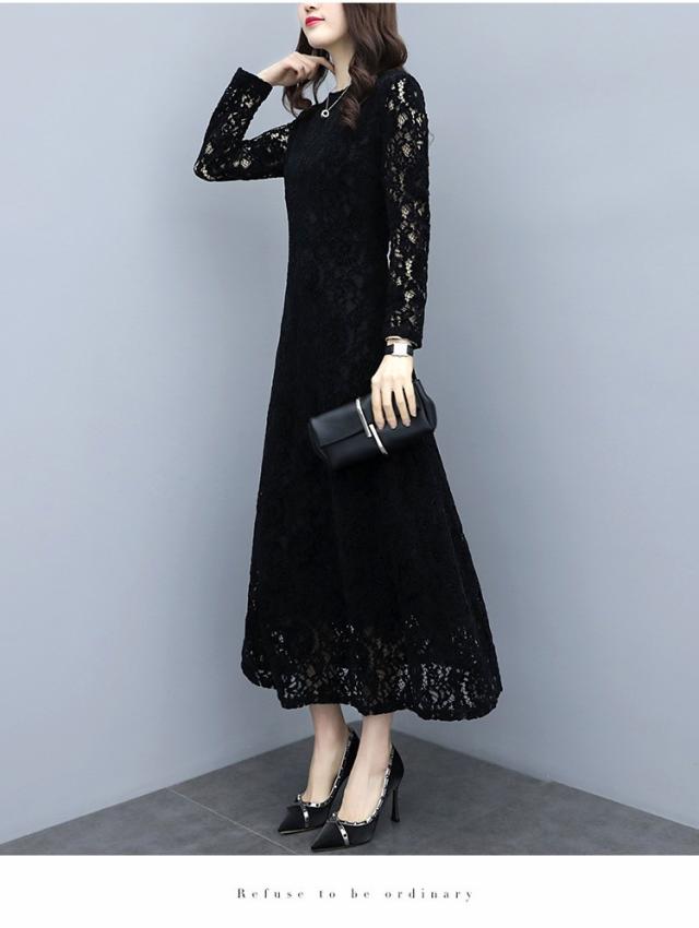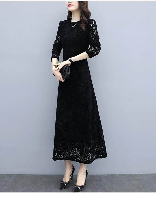 ワンピースドレス レディース 春秋 マキシ丈 レース長袖 ロング丈ワンピース きれいめ 韓国風 結婚式 ドレス 着痩せ オシャレ リネン