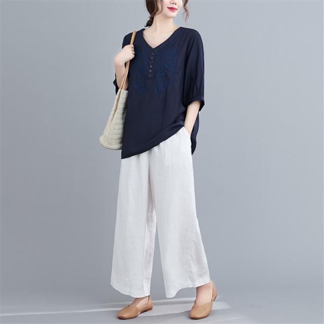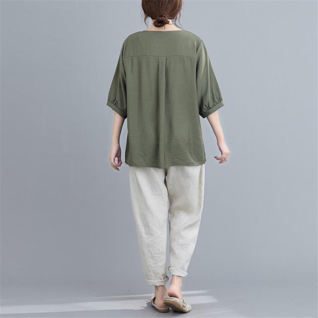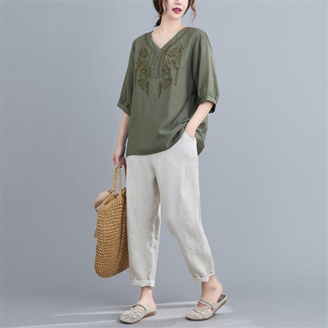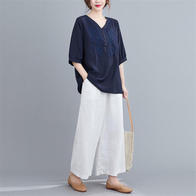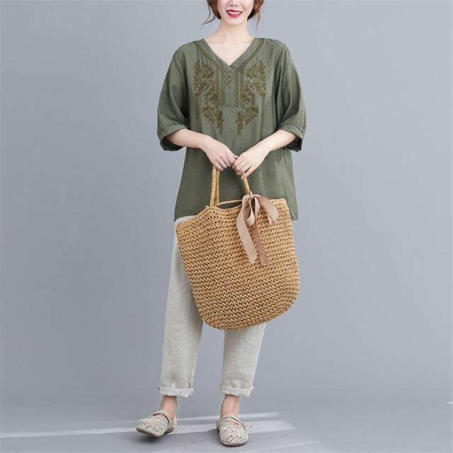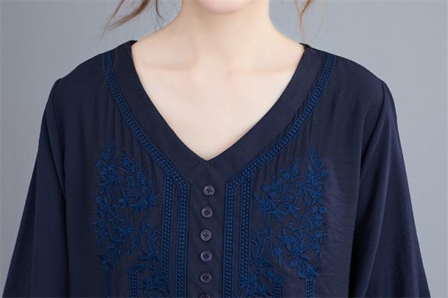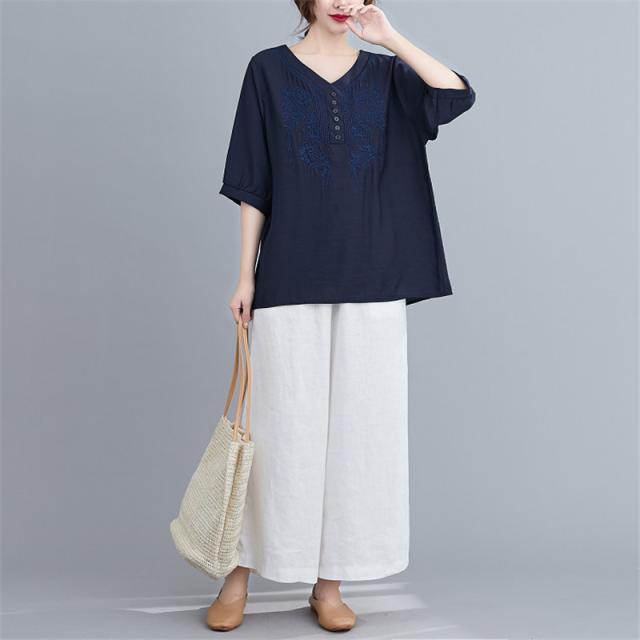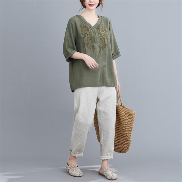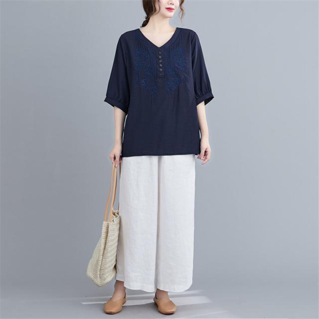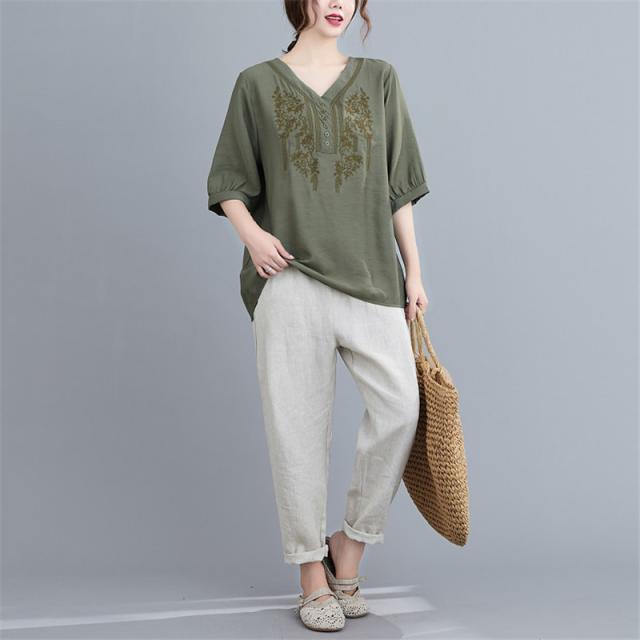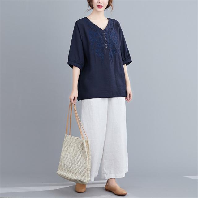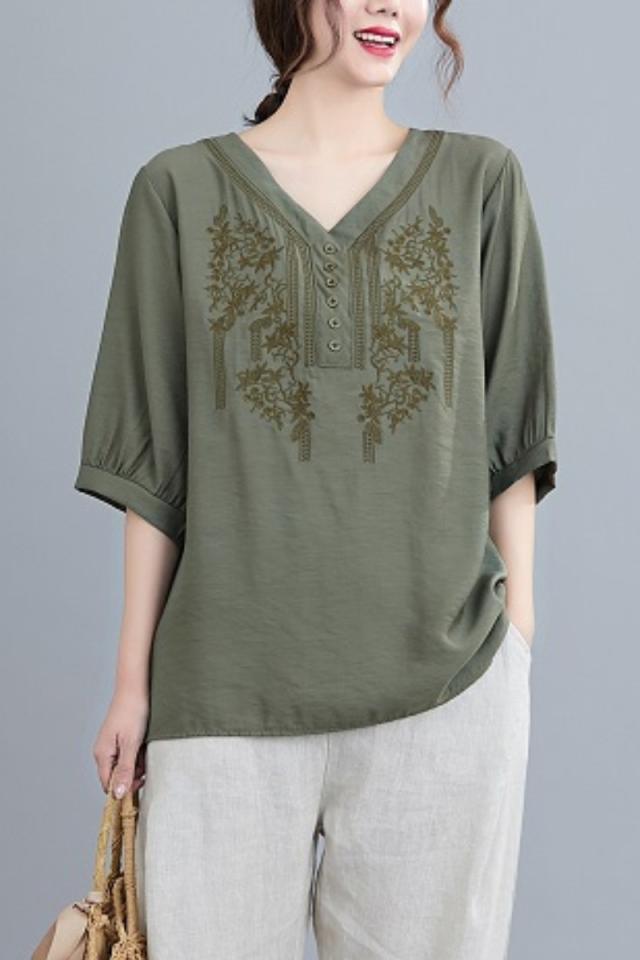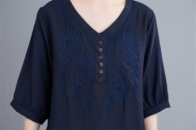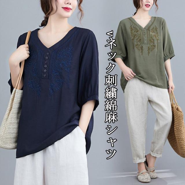 ブラウス トップス シャツ シャツブラウス 春 レディース 夏 花柄 刺繍 Vネック 5分袖 ゆったり 体型カバー プルオーバー 着痩せ 薄手 夏物 通勤 通学
