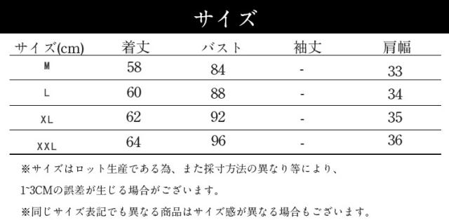 | サイズについての説明 | Tシャツ レディース ノースリーブ タンクトップ 夏 カットソー 春 フェイクレイヤード ロンティー トップス COLOR:白 グレー SIZE:M/L/XL/XXL(お詳しくはサイズ表をご参考迄くださいませ。) ※エコの為、簡易包装でございます。 ※サイズはロット生産である為、1~3CMの誤差が生じる場合がございます。 ※画像の商品はサンプルです。実際の商品と生産ロットによって色味、仕様、加工、サイズ、素材等が若干異なる場合がございます。 ※機械による生産過程において、どうしても生地を織る際の糸の継ぎ目や多少のほつれ、または色ムラなどが生じている場合がございます。 |