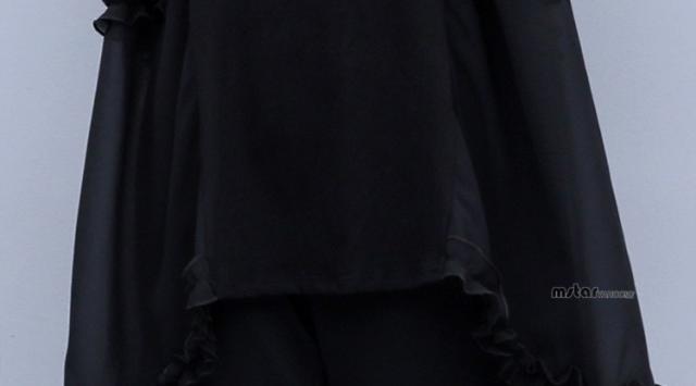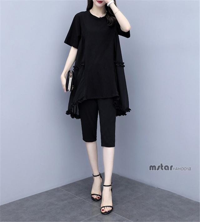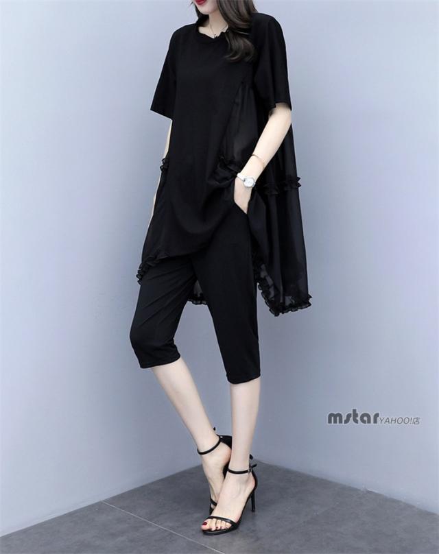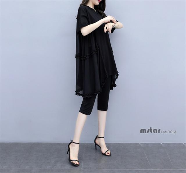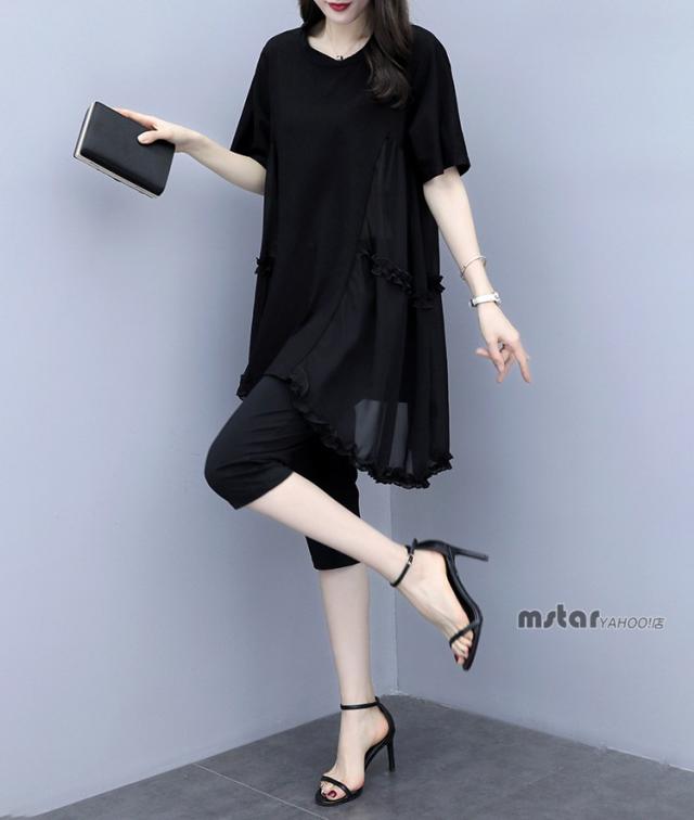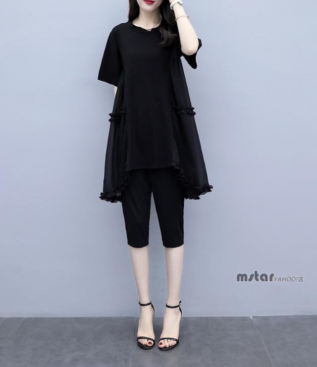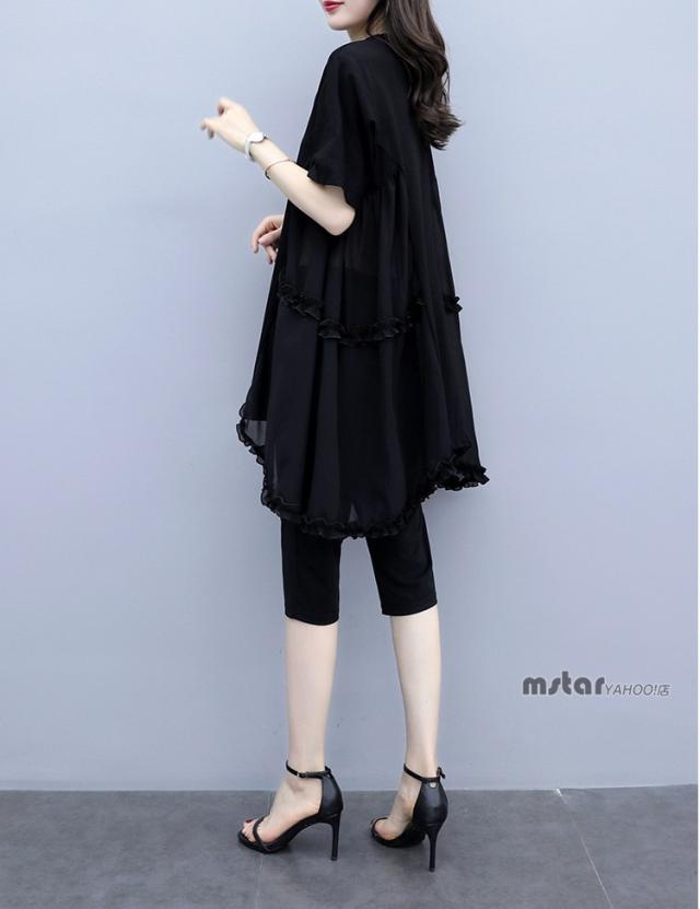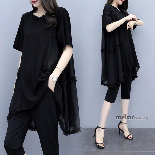 上下セット 2点セットアップ レディース チュニック 半袖 シフォン 切り替え フリル ブラック 黒