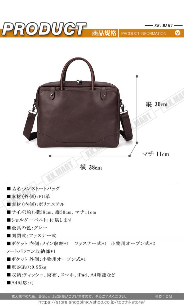 | サイズについての説明 | ■サイズ(約):横38cm、縦30cm、マチ11cm ■ショルダーベルト:付属します ■開閉式:ファスナー式 ■ポケット 内側:メイン収納*1 ファスナー式*1 小物用オープン式*2 ノートパソコン収納部*1 ■ポケット 外側:小物用オープン式*1 ■重さ(約):0.95kg ■収納:ティッシュ、財布、スマホ、iPad、A4雑誌など ■A4対応:可 ハンドバッグ トートバッグ メンズ 2way 手提げバッグ ショルダーバッグ 手提げ 斜めがけ ビジネスバッグ かばん おしゃれ 新作 トレンド カジュアル 革バッグ ショルダー 大きいサイズ 鞄 メンズ コーデ 通勤 通学 大人 男性 ショルダーバッグ A4 人気 カジュアル 肩掛け 20代 30代 40代 大容量 メンズ シンプル きれいめ カバン 鞄 ビジネス 仕事用 旅行 デイリー 通勤バッグ |