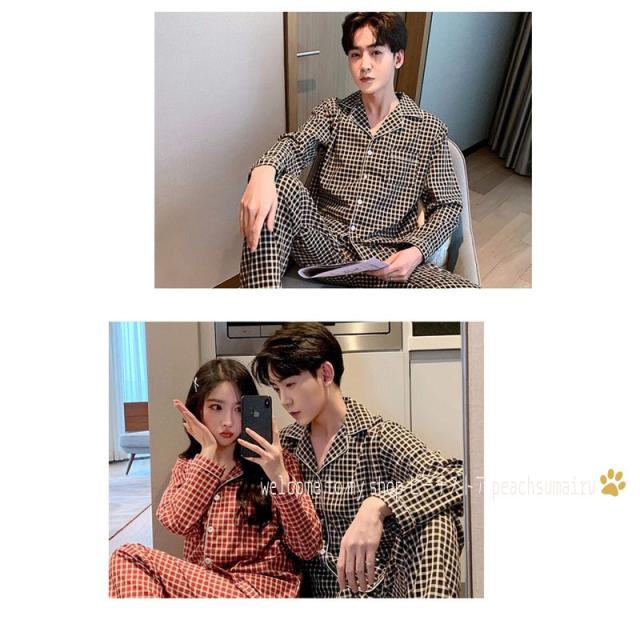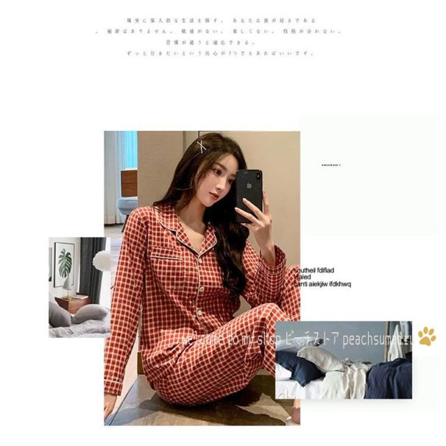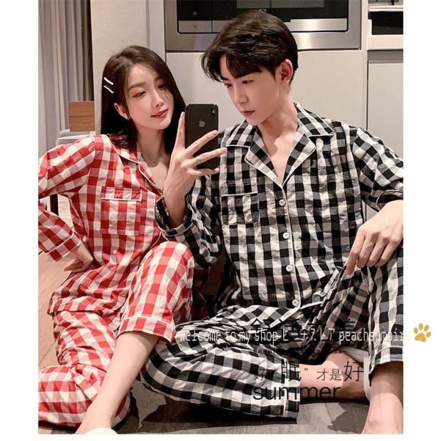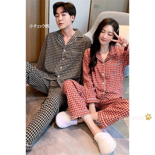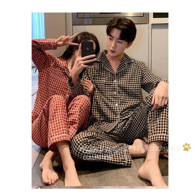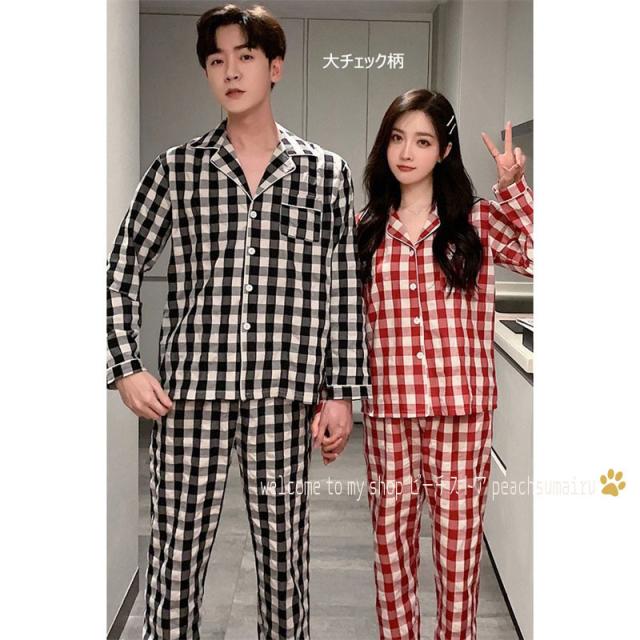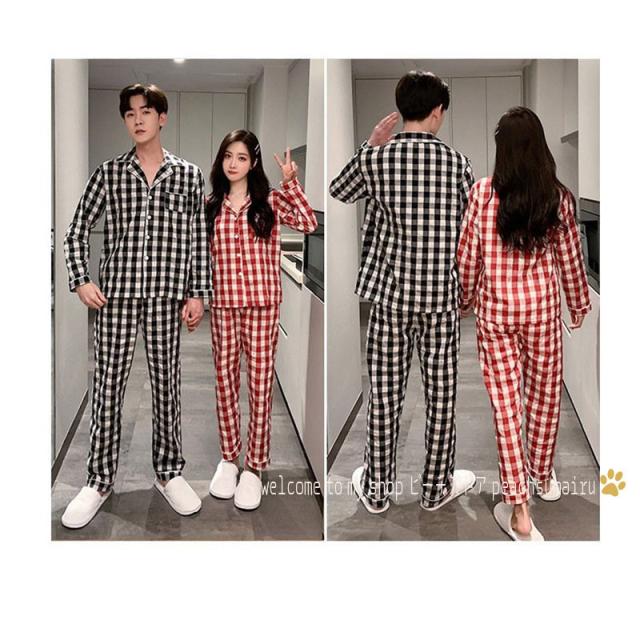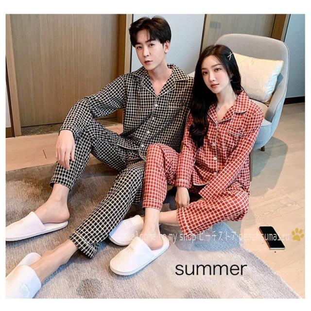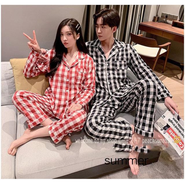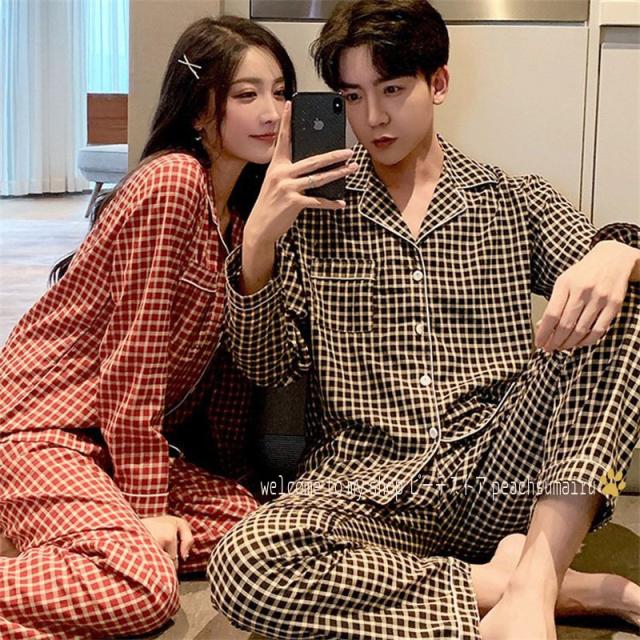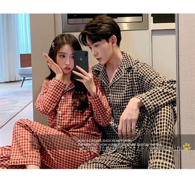 カップルパジャマ ペアパジャマ 春夏秋冬 長袖ルームウェア 綿 ペアルック 寝巻き 可愛いチェック柄上下セットレディース/メンズ部屋着 オシャレ ギフト