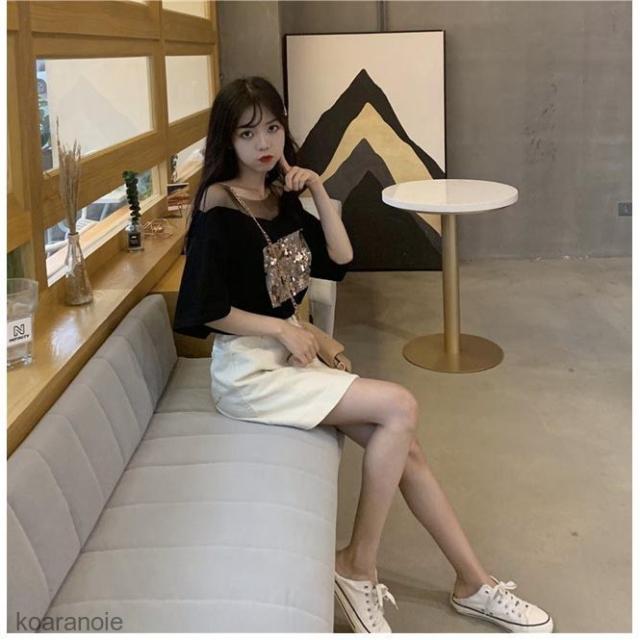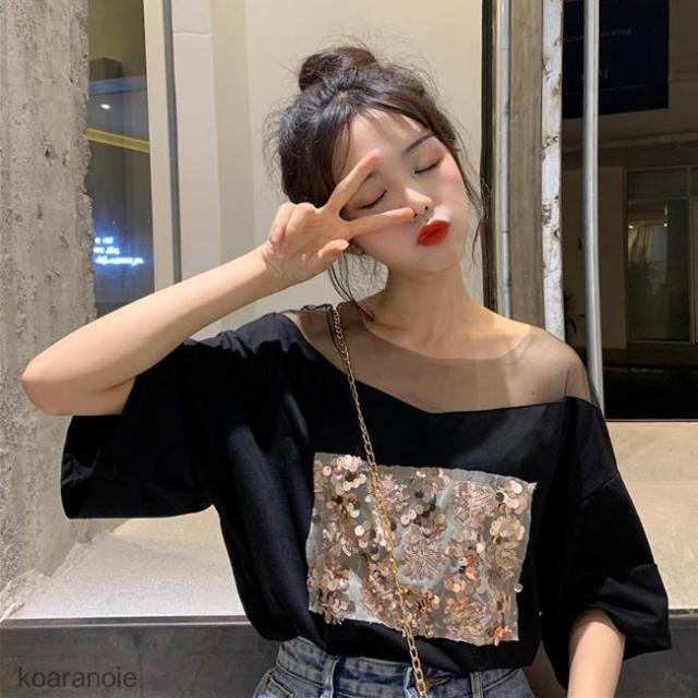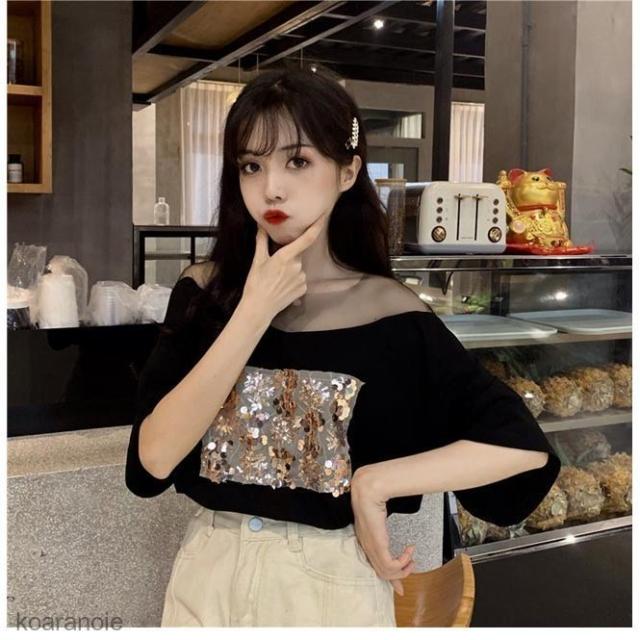 Tシャツ 夏 レディース 半袖Tシャツ 肩出し カットソー オープンショルダー スパンコール トップス ゆったりTシャツ レトロ サマーTシャツ
