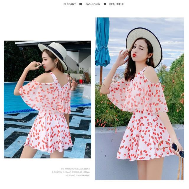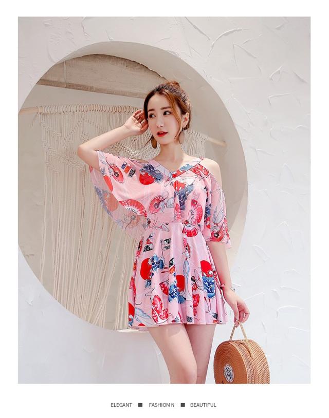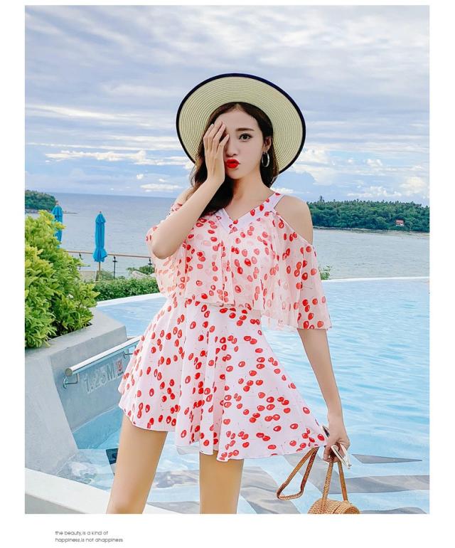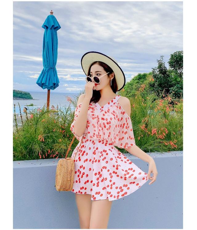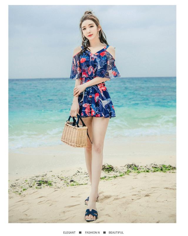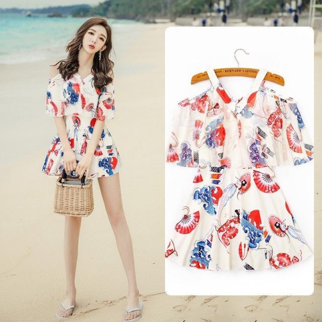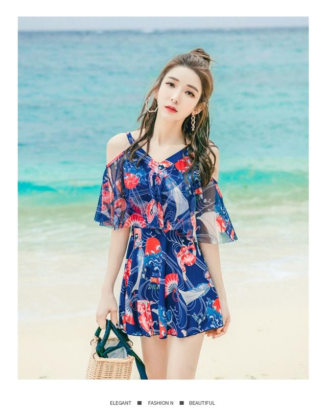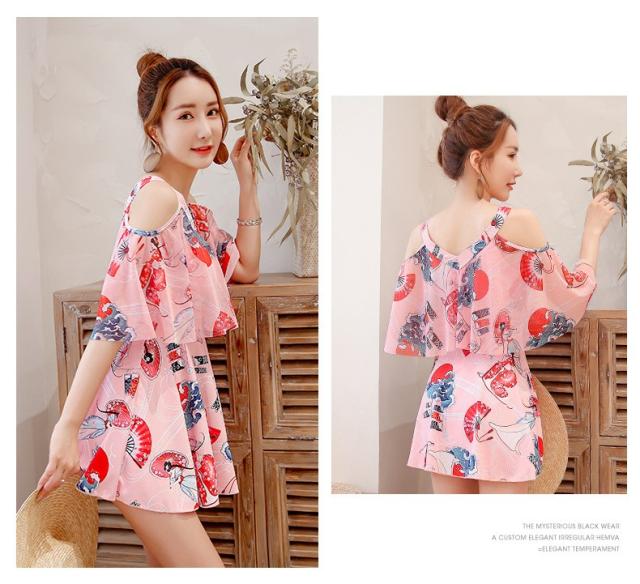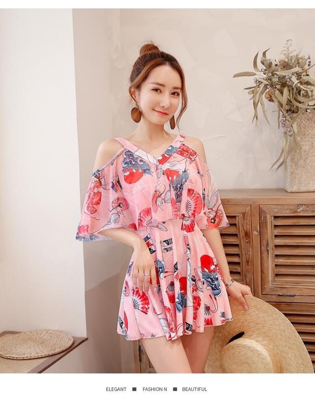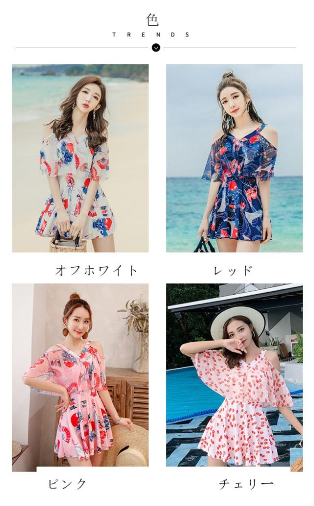 水着 ショートパンツ ワンピース オールインワン セクシー かわいい おしゃれ パッド付き パンツ 肩出し 花柄 可愛い ノンワイヤースイムウェア 温泉水着4色