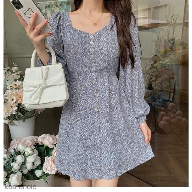 ワンピース 長袖 レディース 柄ワンピ ミニ丈ワンピース 花柄 長袖ワンピース 薄手 スクエアネック レトロ サマーワンピース ショートワンピ