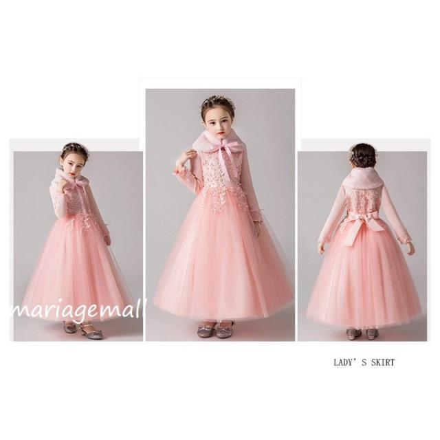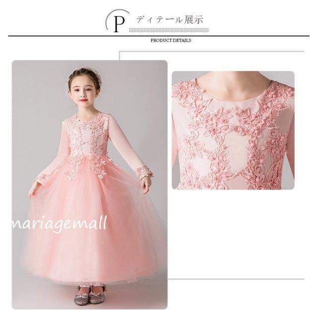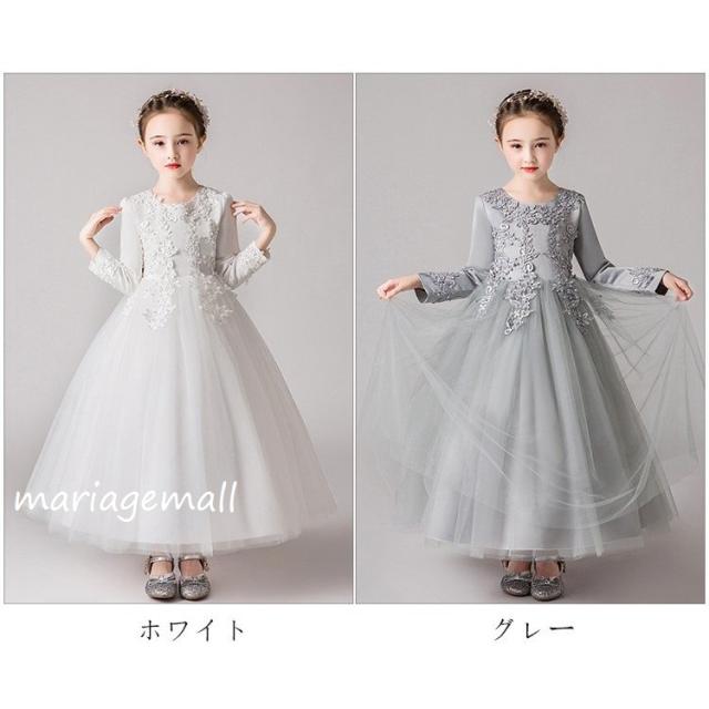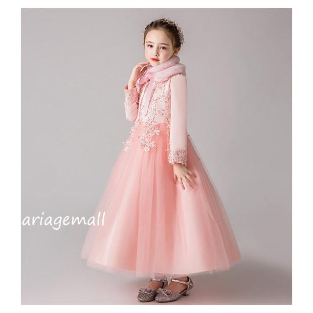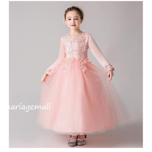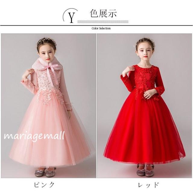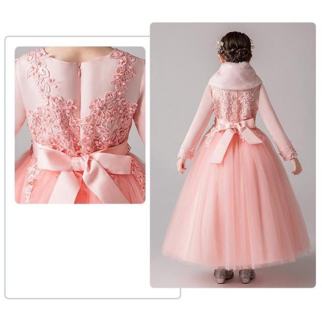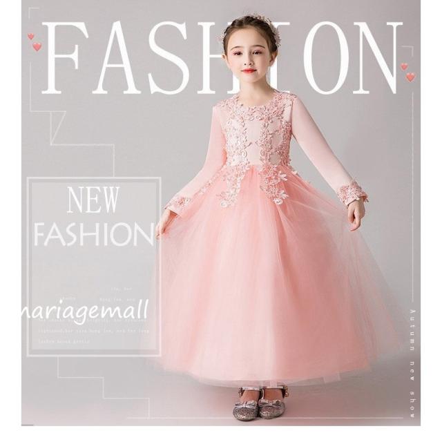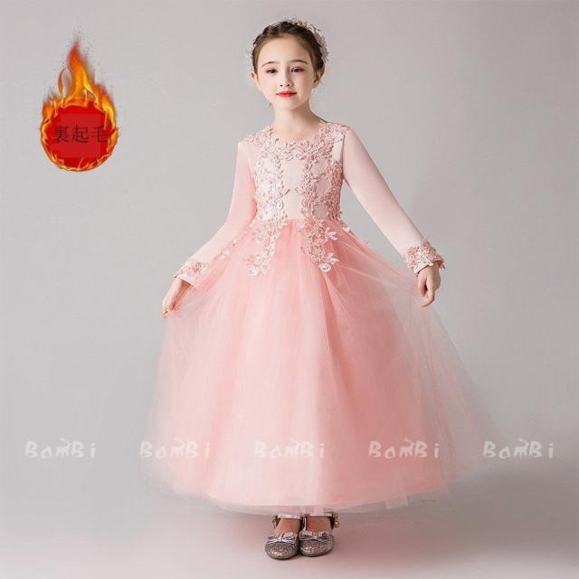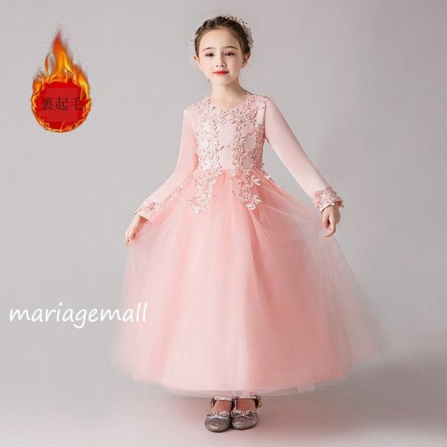 女の子ドレス子供ドレス ピアノ春秋冬発表会 ロング 子どもドレス長袖花刺繍裏起毛ワンピース かわいい 結婚式 2次会 披露宴 パーティー 同窓会演出4色