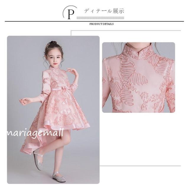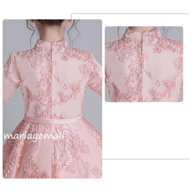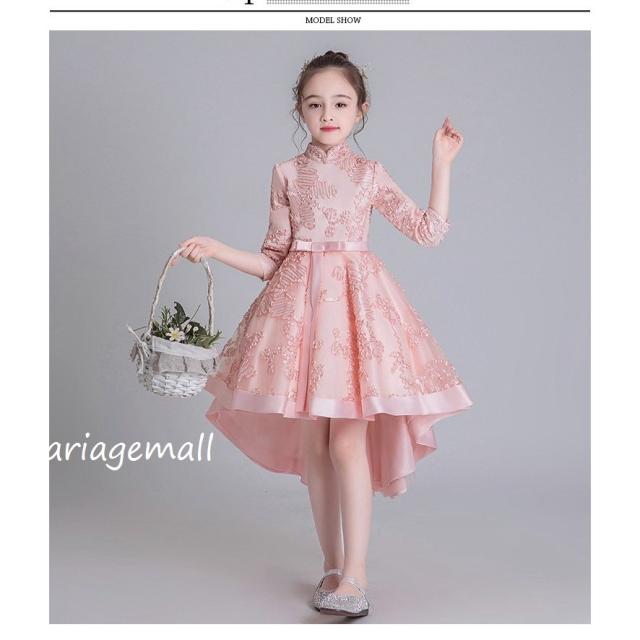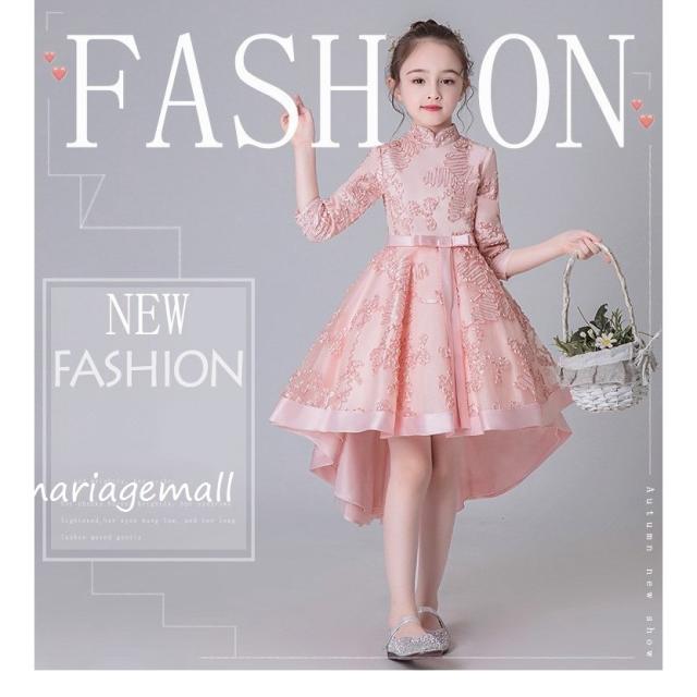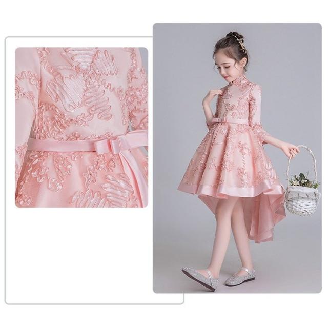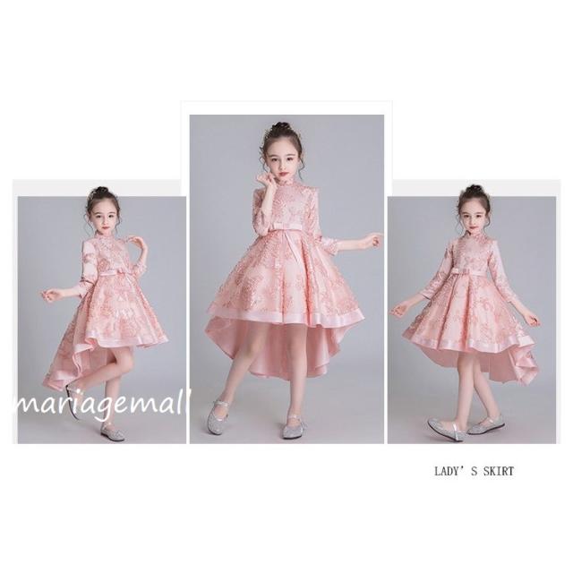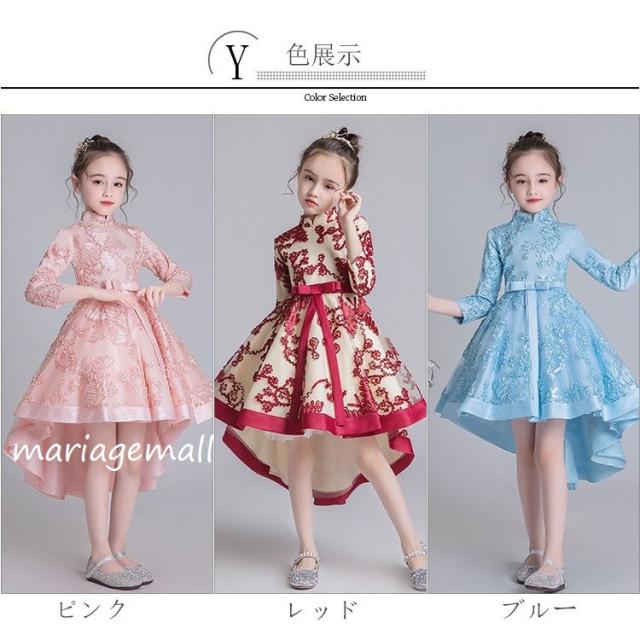 女の子ドレス子供ドレス ピアノ春秋冬膝丈 オープンカラードレス不規則 発表会 ロング 子どもドレス長袖花刺繍ワンピース かわいい 結婚式 演出3色
