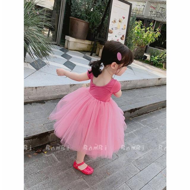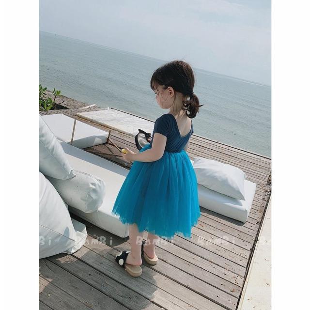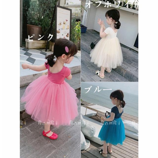 子供服 綿 姫系ワンピース 春夏半袖女の子膝丈 ひざ丈 切り替えチュールスカート プリント おしゃれ 子ども服 女児 シンプル 無地 人気 可愛い演出服