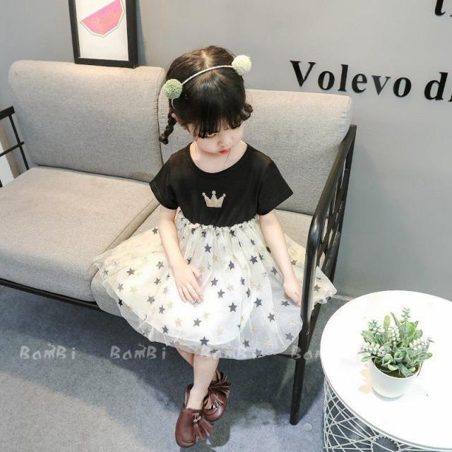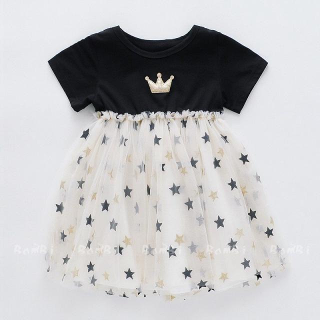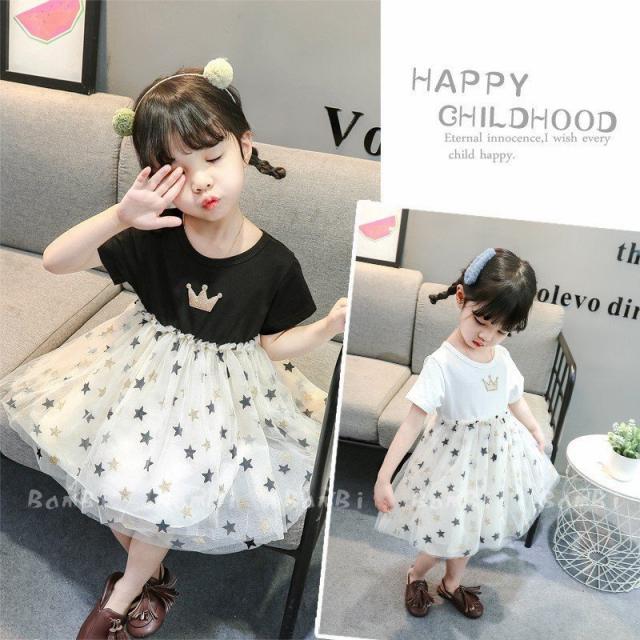 子供服 綿 姫系ワンピース 春夏女の子半袖 膝丈 ひざ丈 切り替え星柄 チュールスカート プリント おしゃれ 子ども服 女児 シンプル 無地 人気 可愛い