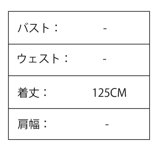 | サイズについての説明 | ★カラー:写真色 ★サイズ:フリーサイズ(単位cm) 【素材】:ポリエステル F:肩幅-バスト-ウエスト- 着丈125 ▼サイズは当店平置き実寸サイズです。 ▼モデル着用写真は撮影環境により、多少実際のカラーと異なる場合がございます。 ▼当商品は機械による生産の過程上、『生地を織る際の糸の継ぎ目』や多少の『ほつれ』、繊維の『混紡 』、形やサイズに多少の『誤差』が生じる場合がございます。 |
