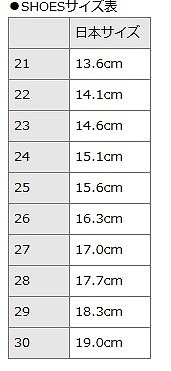| サイズ | 21:13.0cm 22:13.5cm 23:14.0cm 24:14.5cm 25:15.0cm 26:15.5cm 27:16.0cm 28:17.0cm 29:17.5cm 30:18.0cm |