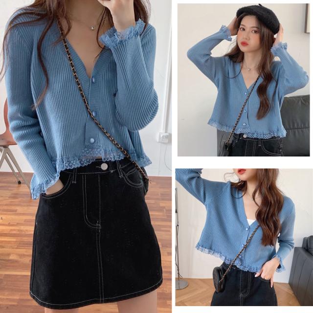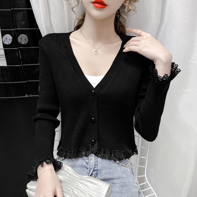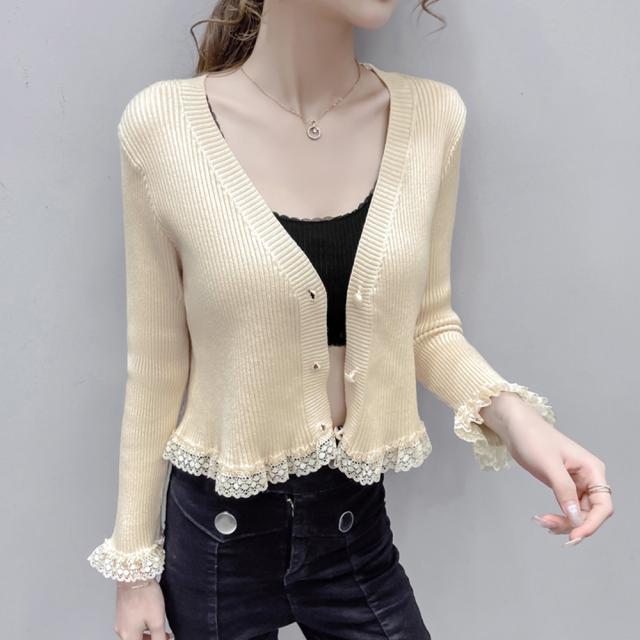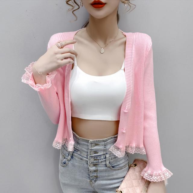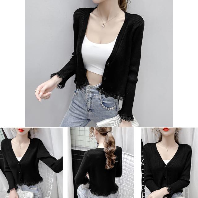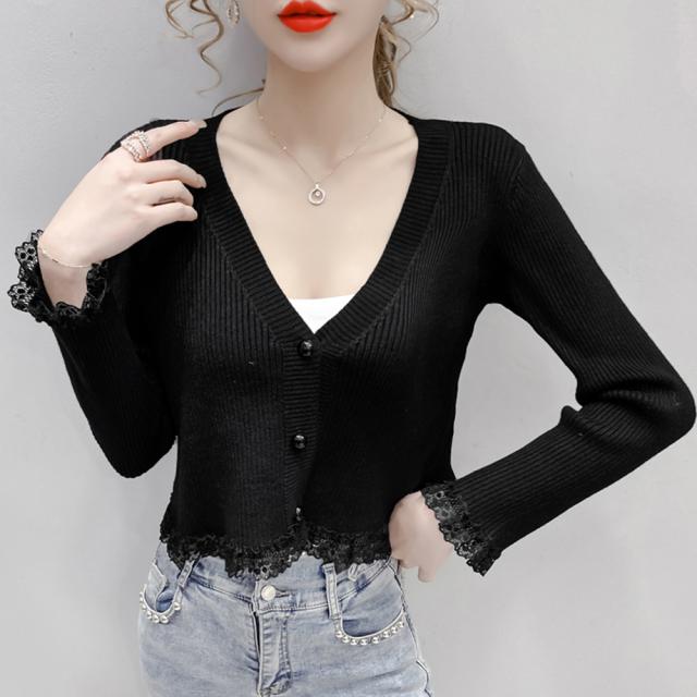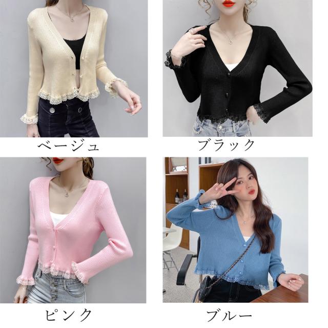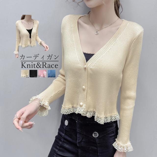 ニットカーディガン ショート丈 セーター Vネック レース入り リブニット 大人可愛い カジュアル お出かけ 防寒