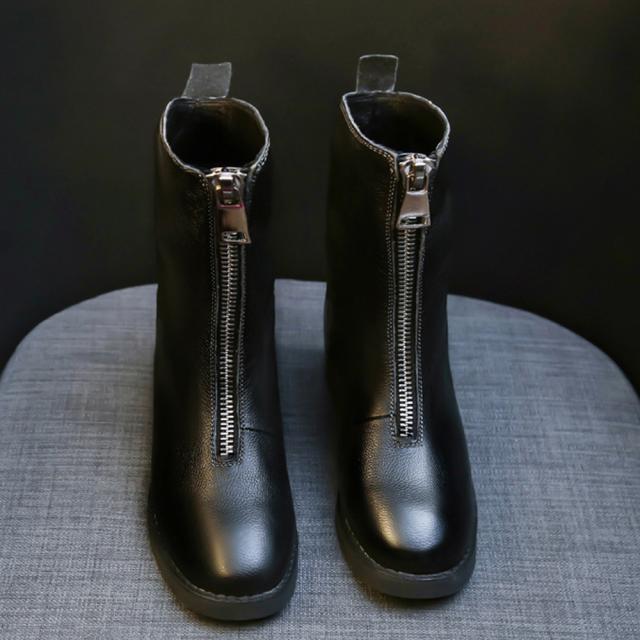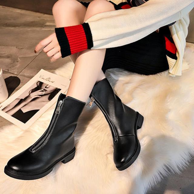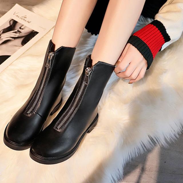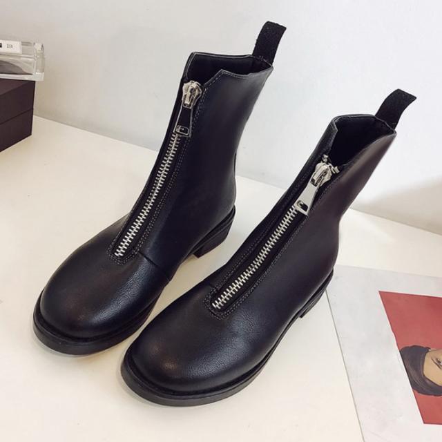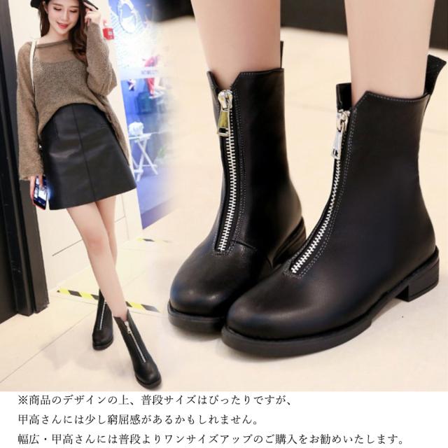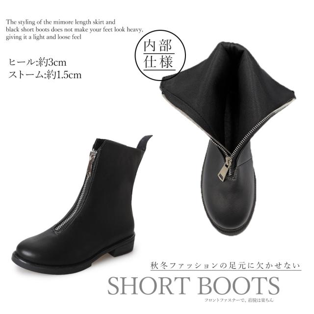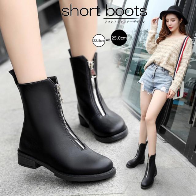 ショートブーツ 黒 レディース ぺたんこ フロントファスナー ブーティ 秋冬 ラウンドトゥ ローヒール シューズ 履きやすい
