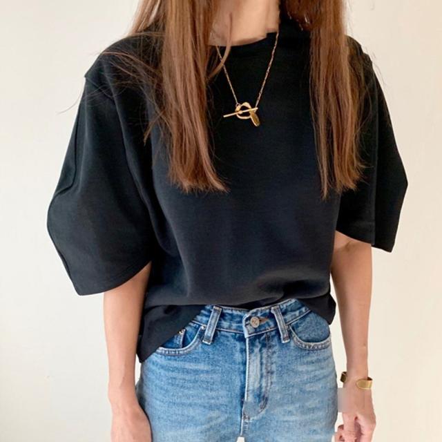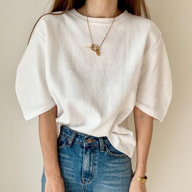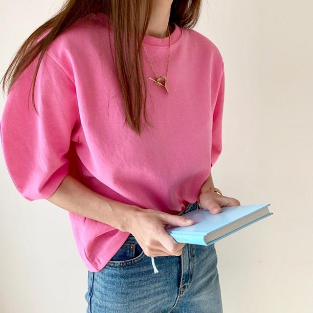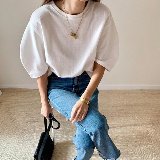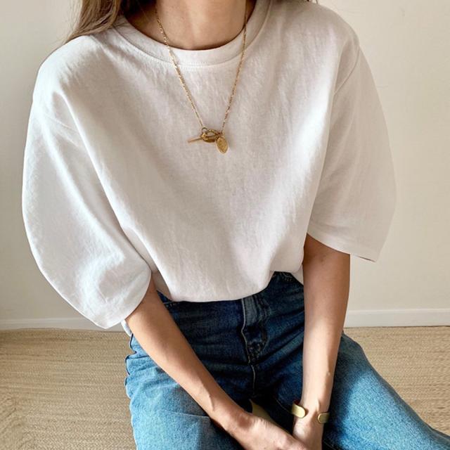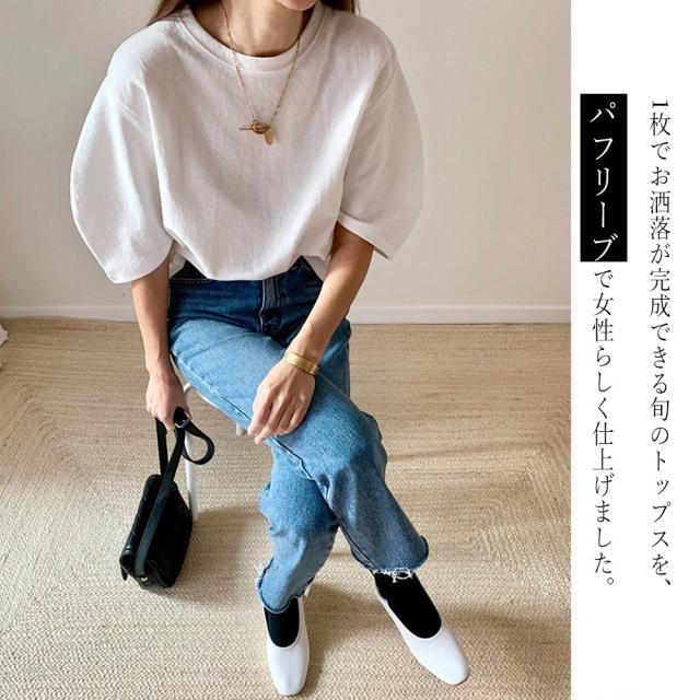 パフスリーブ Tシャツ レディース 夏 半袖 カットソー ラウンドネック トップス カジュアル プルオーバー コットン【ネコポス可】