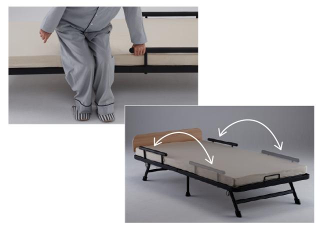 立ち上がりの補助や布団の滑り止めになるグリップ2本が付属。設置場所や用途に合わせて前後2箇所の取り付け位置が選べます。(差し込みタイプ)スペース有効活用