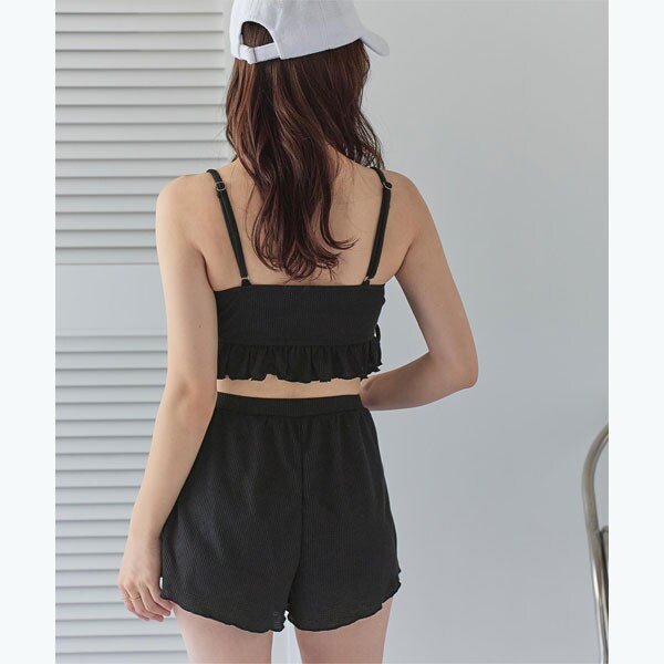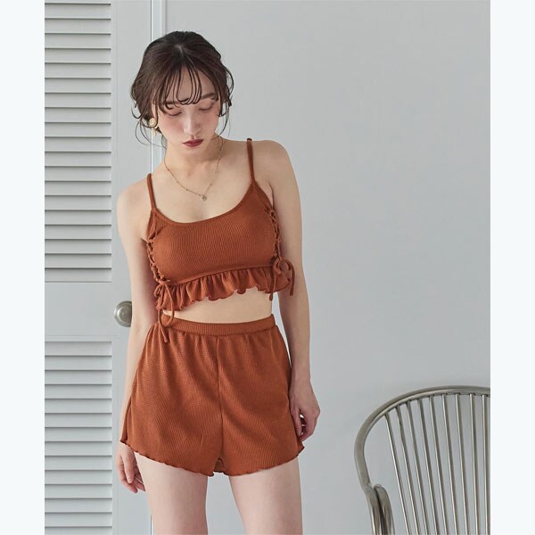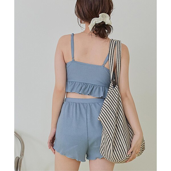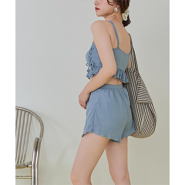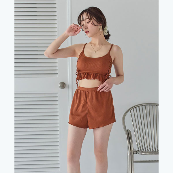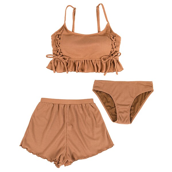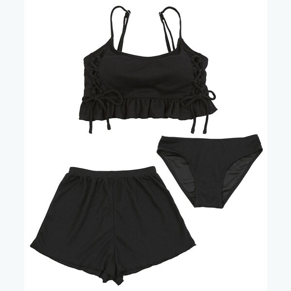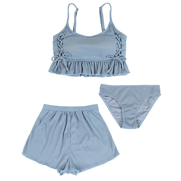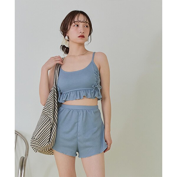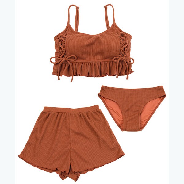 ビーチ映えする肌触りの良いミニワッフル素材のショートパンツ付きビキニ。