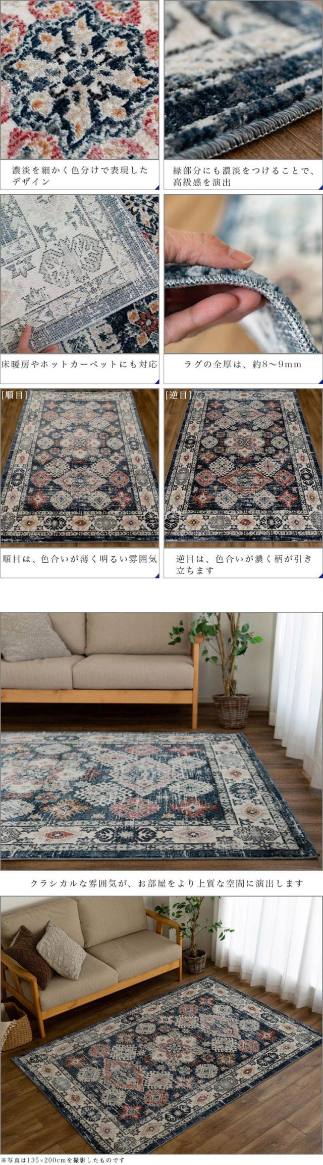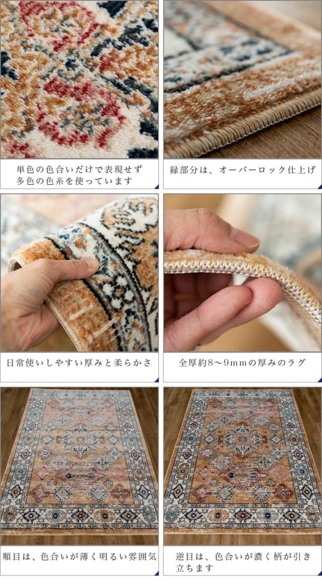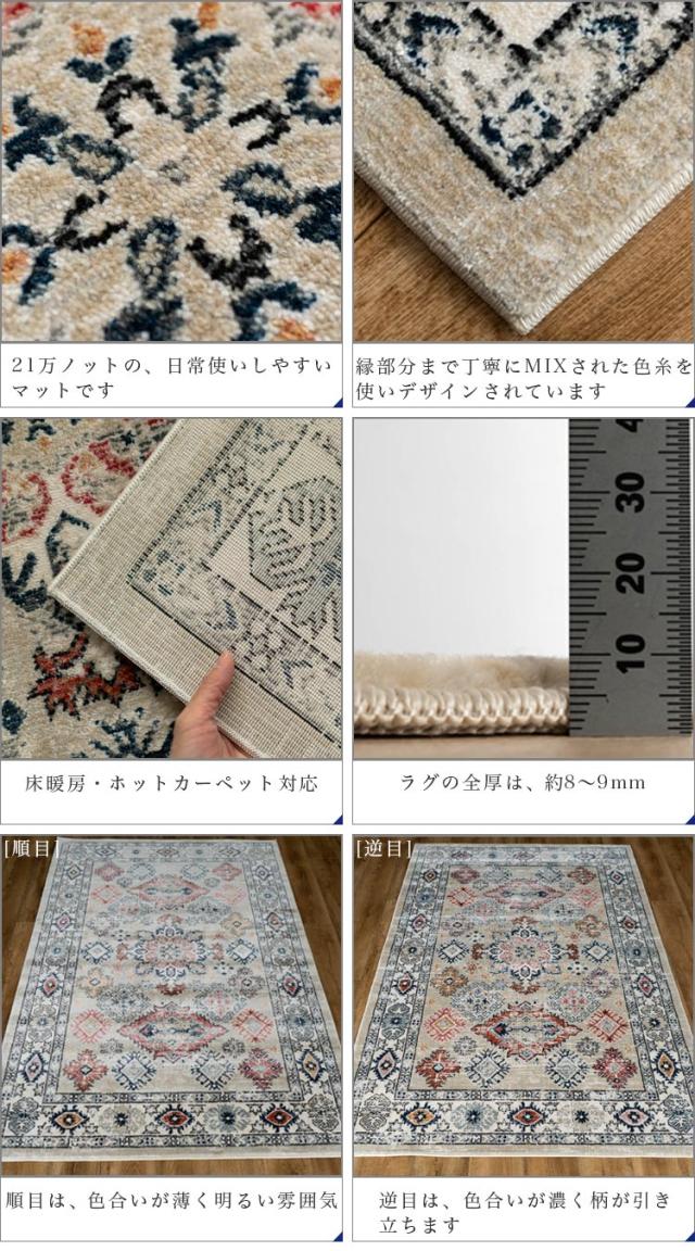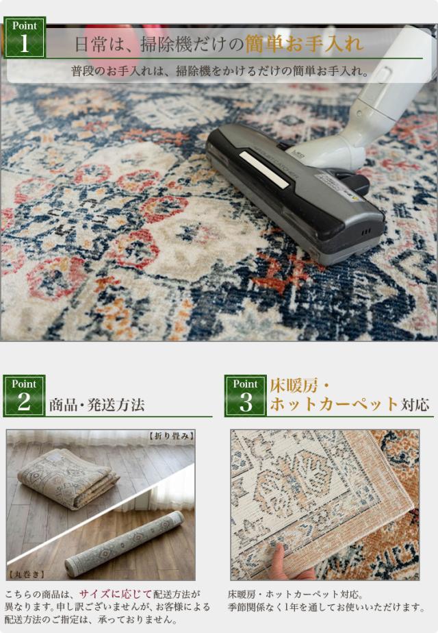 | 【こちらの商品の梱包方法】 ・サイズに応じ「折り畳み」「丸巻き」のどちらかで配送いたします。(お客様によるご指定はいただけません) ※商品は開梱時、ラグマット、カーペットの毛並みにムラなどがございますが、使用するにつれ、なくなります。 ※商品によりサイズに多少の誤差があります。 ※カラーはディスプレイ上、実際の色と多少異なる場合がございます。 ※ウィルトン織りの製法により、使用され、裏面に塗られる仕上げの接着塗料は、ご使用当初、常温のもとで気化( 蒸発 )する、揮発性の匂いがございます。 ※滑りやすい場所でのご使用は市販のカーペット用の滑り止めネットのご使用をお勧めします。 ※汚れた場合は、カーペットクリーナー、中性洗剤などを薄め固く絞ったタオルなどで拭き取ってください。 | |