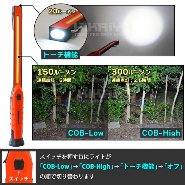 | 明るさ | COB-High:300lm COB-LOW:150lm トーチ:20lm |