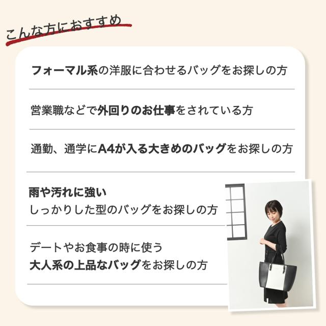 ・フォーマル系の洋服に合わせるバッグをお探しの方 ・営業職などで外回りのお仕事をされている方 ・通勤、通学にA4が入る大きめのバッグをお探しの方 ・雨や汚れに強いしっかりした型のバッグをお探しの方 ・デートやお食事の時に使う大人系の上品なバッグをお探しの方 |