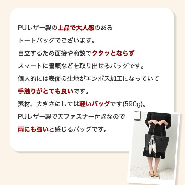 ご覧頂き誠にありがとうございます!!! PUレザー製の上品で大人感のあるトートバッグでございます。 自立するため面接や商談でクタッとならずスマートに書類などを取り出せるバッグです。 個人的には表面の生地がエンボス加工になっていて手触りがとても良いです。 素材、大きさにしては軽いバッグです(590g)。 PUレザー製で天ファスナー付きなので雨にも強いと感じるバッグです。 |
