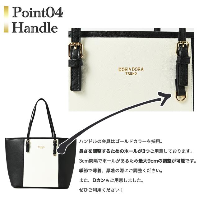 メインポケットに6つのポケットが付いている大人向けトートバッグです。 4種類のバリエーションをご用意。 ハンドルの金具はゴールドカラーを採用いたしました。 天ファスナー付きでセキュリティ面も万全です。 底面に4つ鋲を付けましたのでバッグを置いても汚れにくいです! |