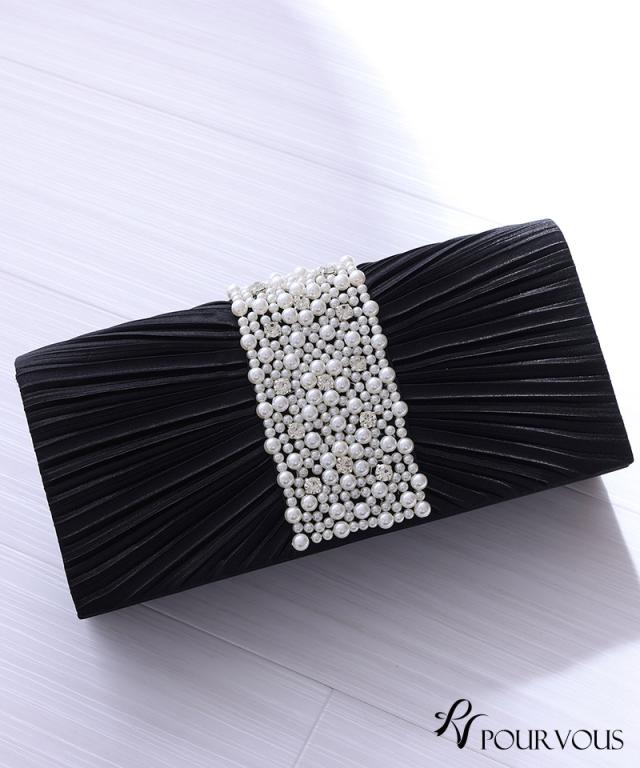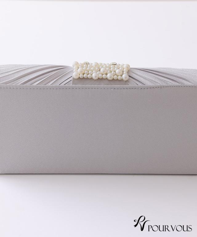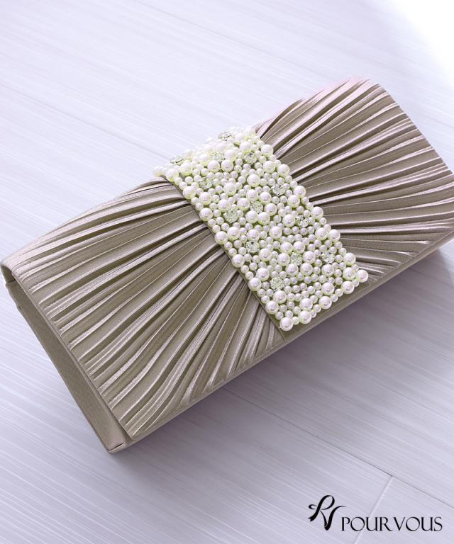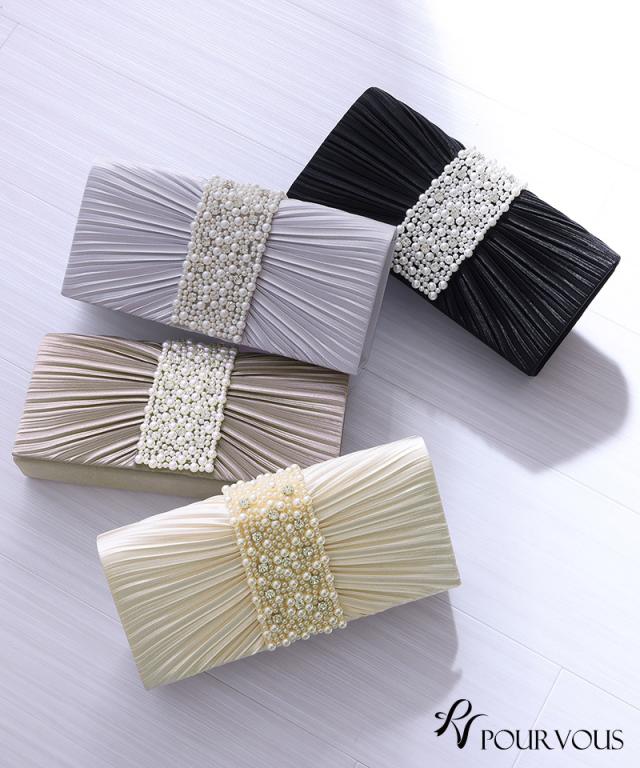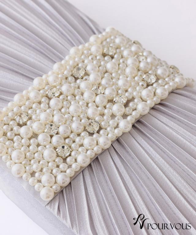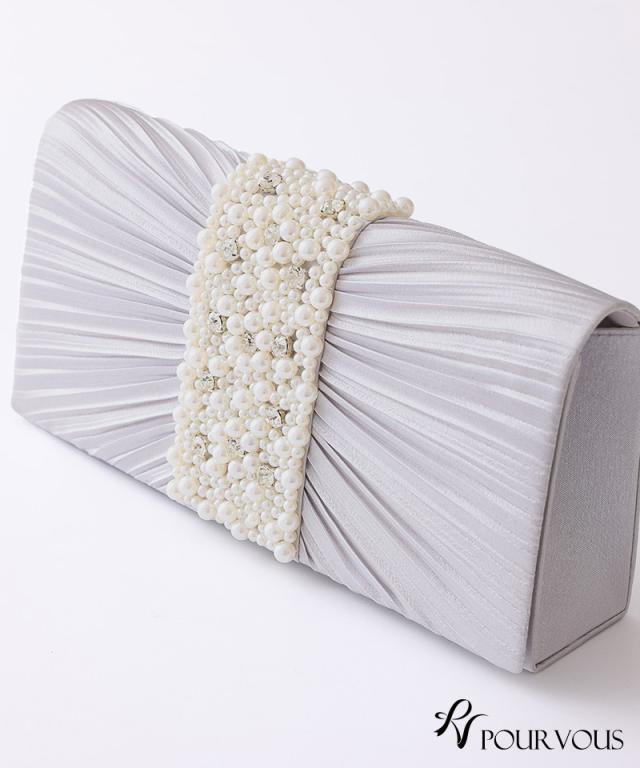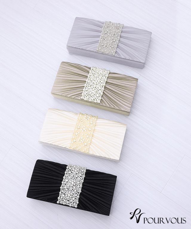 上品に輝くサテンのプリーツとパールビジューが華やかな印象のクラッチバッグ。