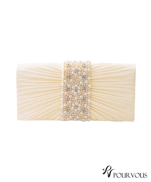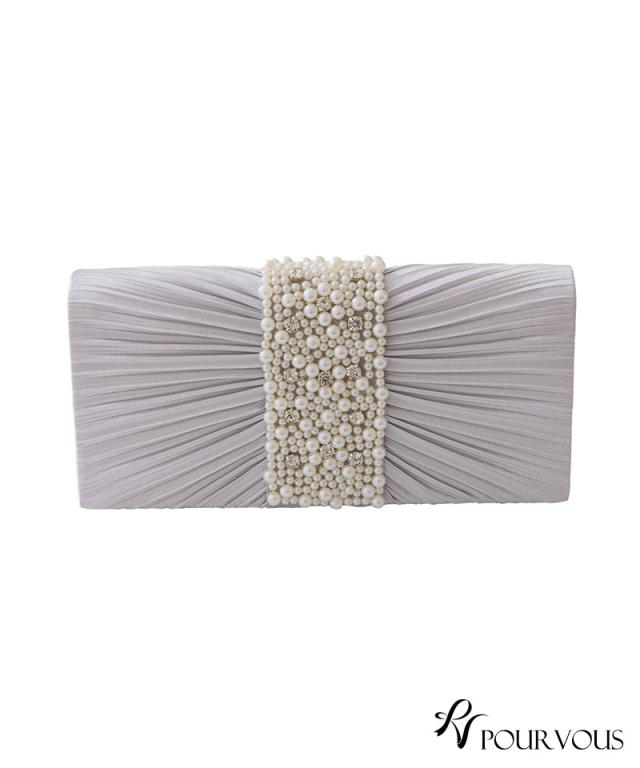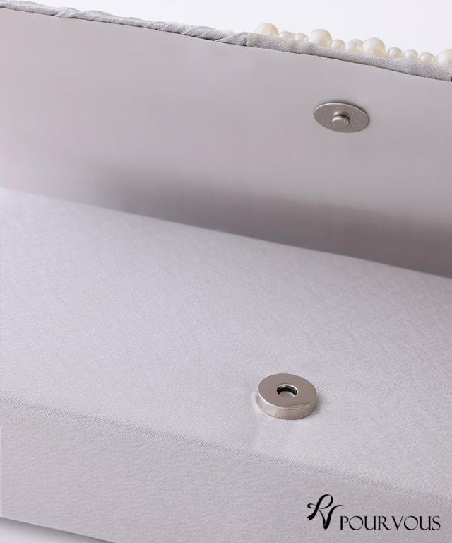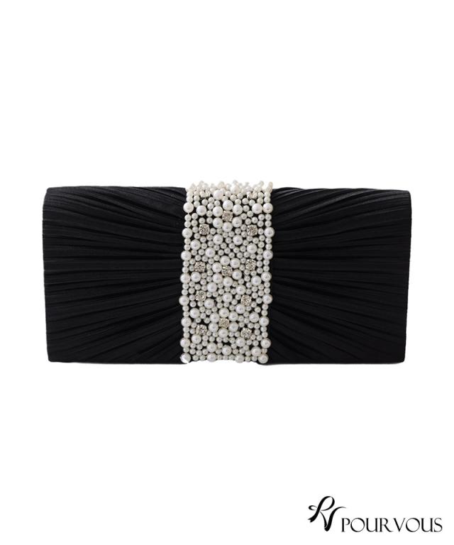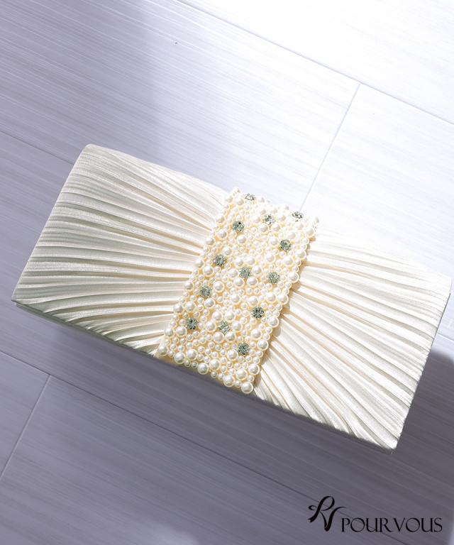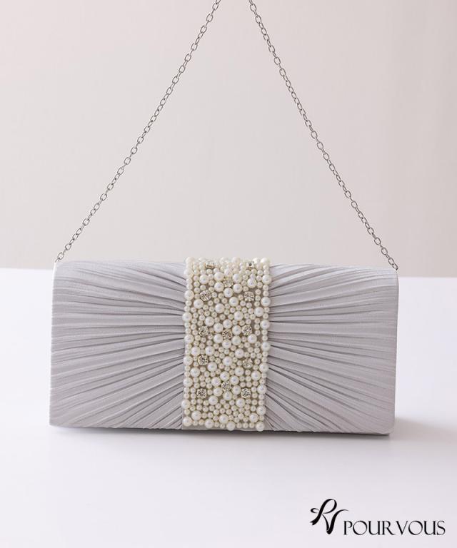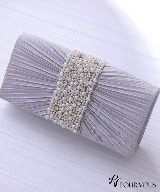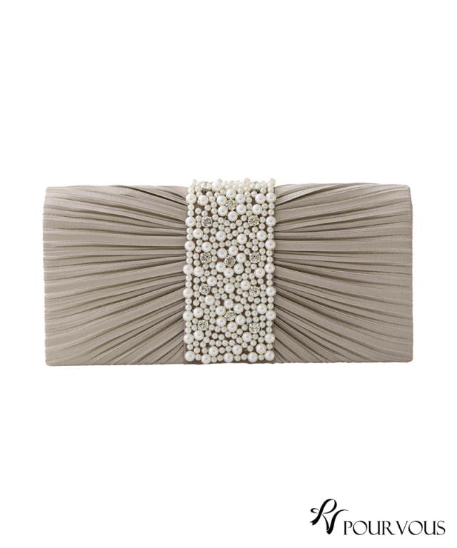 上品に輝くサテンのプリーツとパールビジューが華やかな印象のクラッチバッグ。