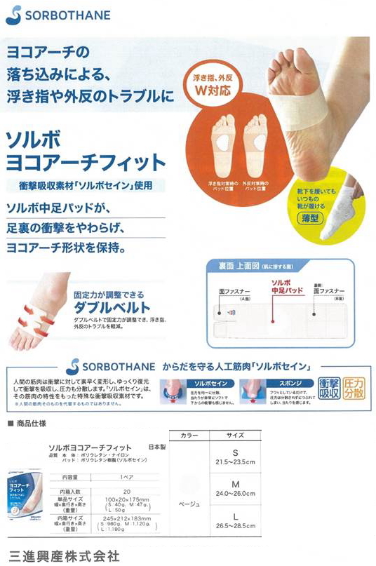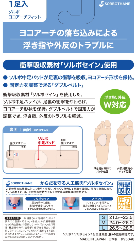 衝撃吸収素材「ソルボセイン」を使用したソルボ中足パッドが、足裏の衝撃をやわらげ、ヨコアーチ形状を保持。ダブルベルトで固定力が調整でき、浮き指、外反のトラブルを軽減。【内容量】1ペア【サイズ】●Sサイズ(21.5〜23.5cm)●Mサイズ(24.0〜26.0cm)●Lサイズ(26.5〜28.5cm)【素材】●本体:ポリウレタン、ナイロン●パッド:ポリウレタン樹脂(ソルボセイン)【製造国】日本製【メーカー】三進興産株式会社