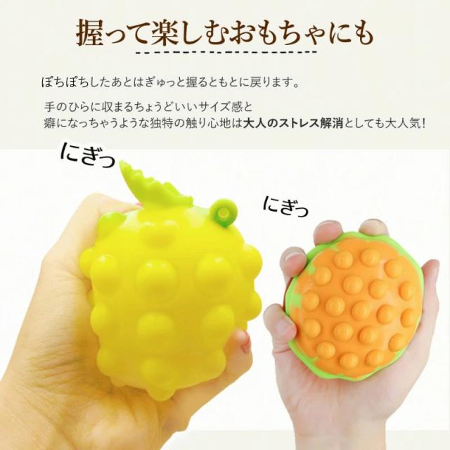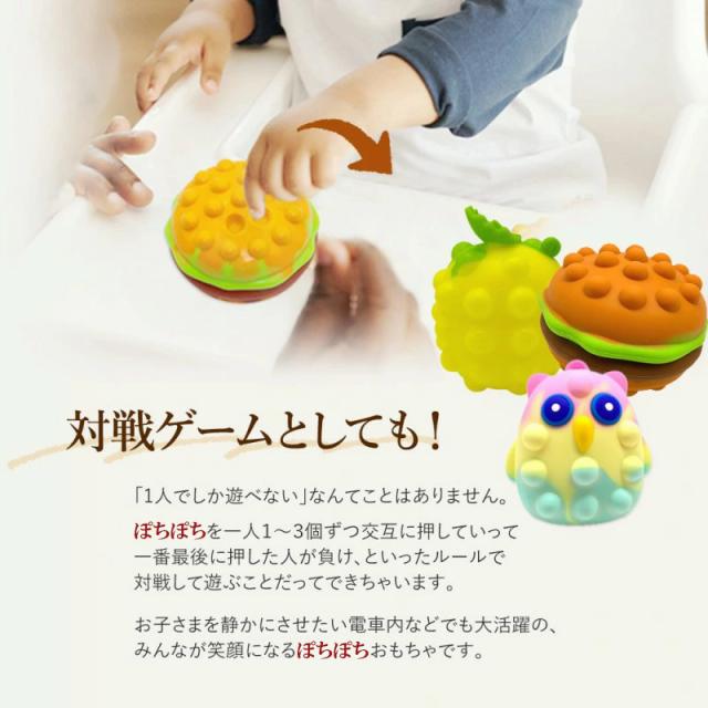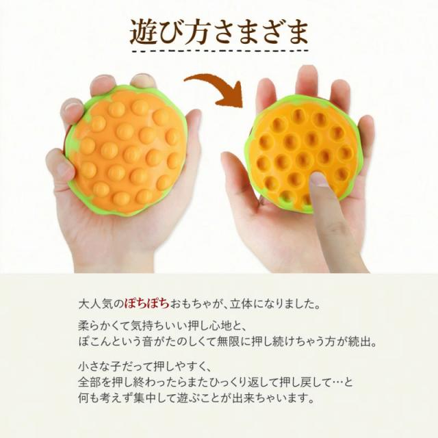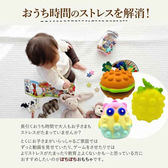 | 商品の説明 | 長引くおうち時間で大人もお子さまもストレスがたまっていませんか? とくにお子さまがいらっしゃるご家庭ではずっと動画を見せていたり、ゲームをさせたりでは よりストレスがたまったり教育上よくないかも、と思っている方におすすめしたいのがぽちぽちおもちゃです。 大人気のぽちぽちおもちゃが、立体になりました。 柔らかくて気持ちいい押し心地と、ぽこんという音がたのしくて無限に押し続けちゃう方が続出。 お子さまを静かにさせたい電車内などでも大活躍の、 みんなが笑顔になるぷっちぷちおもちゃです ぷっちぷちしたあとはぎゅっと握るともとに戻ります。 手のひらに収まるちょうどいいサイズ感と 癖になっちゃうような独特の触り心地は大人のストレス解消としても大人気!. リラックスグッズとしても大人気のぽちぽちおもちゃは、年齢を問わず幅広い層におすすめです。 お仕事の電話や、作業中の息抜きに。 落としても割れないシリコン素材。水で丸洗い可能です。 |