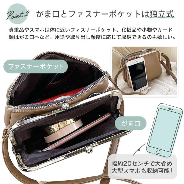 【がま口とファスナーポケットは独立式で収納力抜群、大型スマホも収納可能】