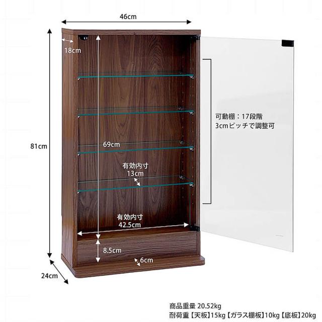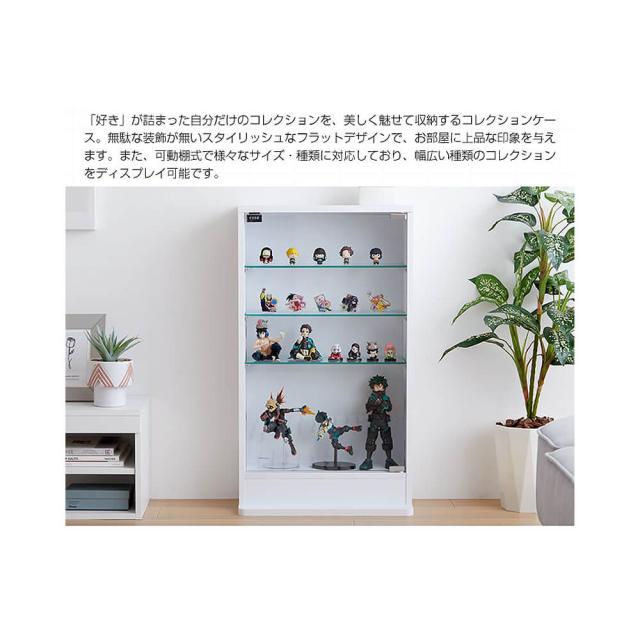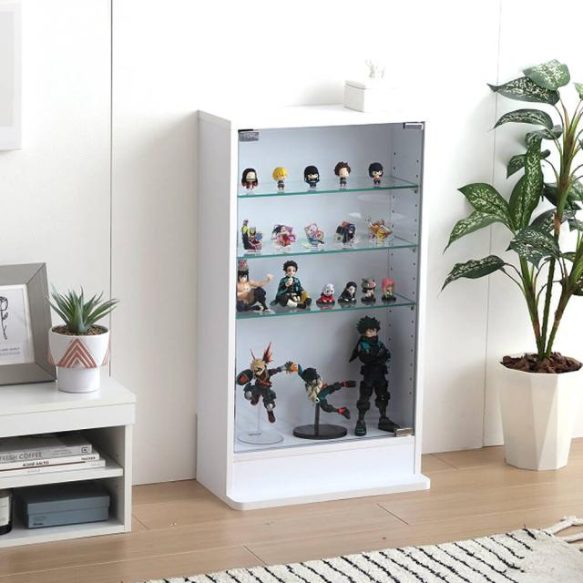 高さのあるフィギュアやプラモデルにも。棚部分もガラス素材なので、棚の奥谷下段まで光が届きやすい仕様です。