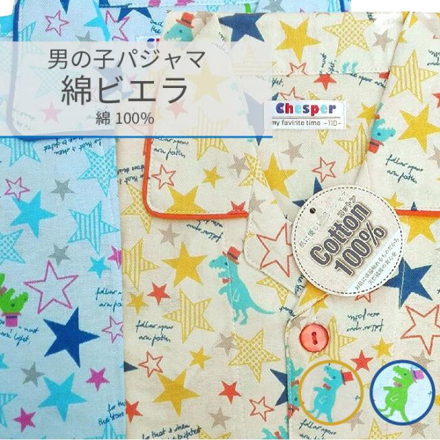男の子 パジャマ 【恐竜と星柄】【春・秋】ブルー・クリーム 100〜120cm(3〜8歳) 綿100% ビエラプリント 男の子 キッズパジャマ こども ナイトウェア