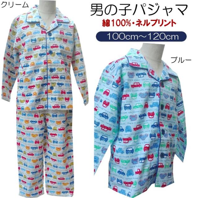 男の子 パジャマ 春 秋 冬 綿100% ネル素材 男の子 車柄 キッズパジャマ 100〜120cm(3〜8歳) こども ブルー クリーム ナイトウェア
