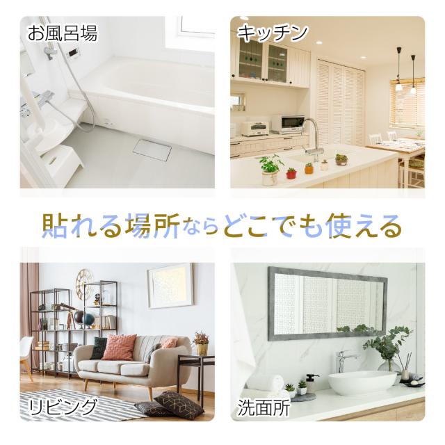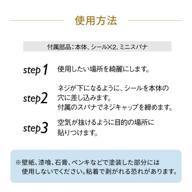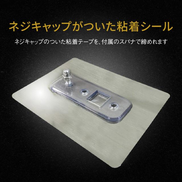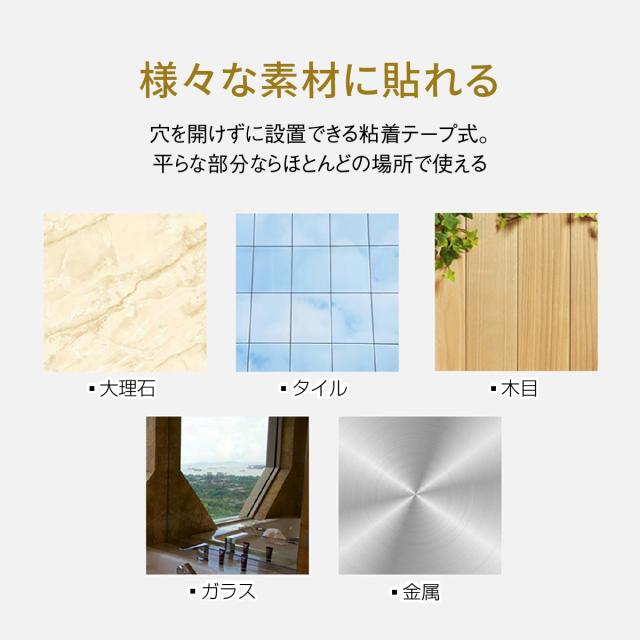穴を開けずに設置できる粘着テープ式。平らな部分ならほとんどの場所で使える。